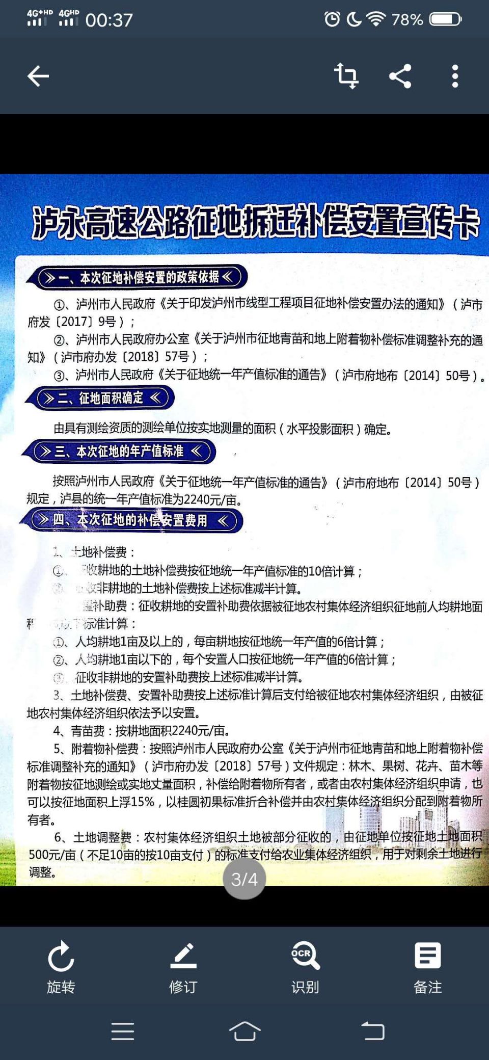 2、根据泸州市人民政府关于征地统一年产值标准的通告(泸市府地布[2014]50号)文件,泸县征收耕地的征地统一年产值标准为2240元/亩。
