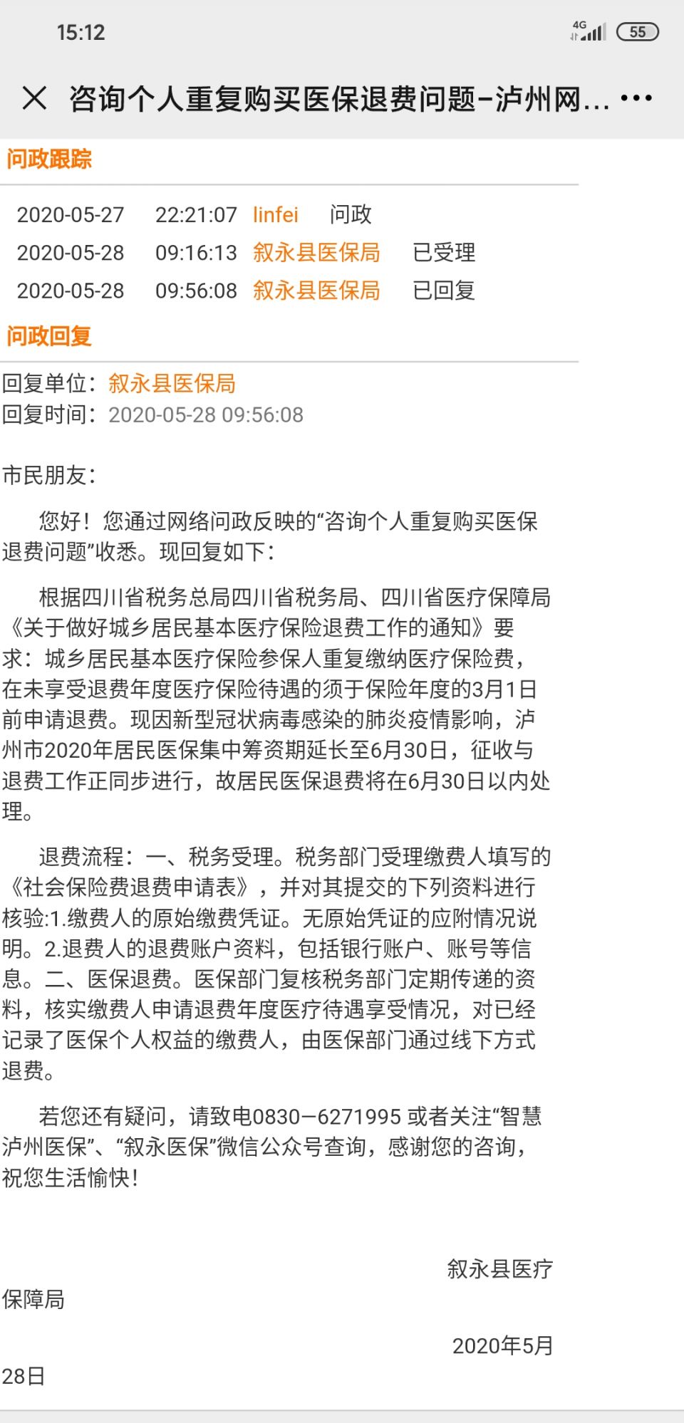 本人系叙永籍大学毕业生,由于重复购买医保,于去年12月份在村委会申请2020年度医保退费,申请退费资料全部填写完整,村上工作人员说2月份退费,但是到了2月份没有收到退费,于是又在五月份的时候在问政平台咨询退费,叙永县医保局给我的回复是6月30日之前退费,但是这都已经是7月份了还没有收到退费,想知道这是怎么回事,难道官方也在欺骗我们老百姓吗?