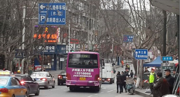 在慈善路人民医院路口处有指路标志,道路左侧标志指示方向为滨江路停车场位置;道路右侧标志是指示机动车需直行到三星街路口进行左转进入三星街后,进入新马路到达停车场的线路。在慈善路人民医院路口直接左转进入新市府路后,道路右侧有禁止直行、右转标志,直行进入停车场的机动车将按照违反禁令标志行为进行处罚。请驾驶员从三星街、市府路绕行进入滨江路停车场。