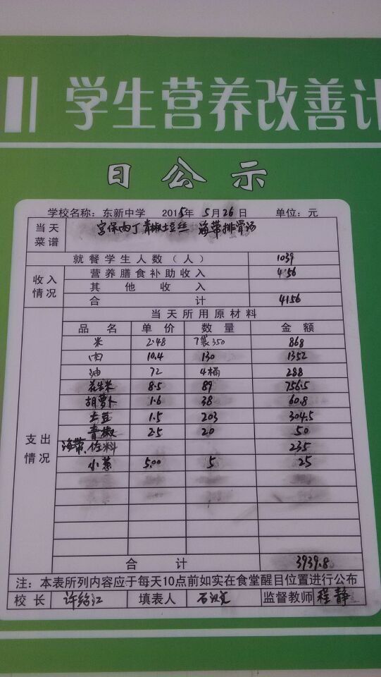 作为学校的营养餐表示很感谢,但是东新中学的希望领导们好好的查一查,比如花生米现在市场价7元,但这上面8.5元,希望用于改善学生营养的钱能真正用到学生身上。 对此,我们表示谢谢,会一直关注。