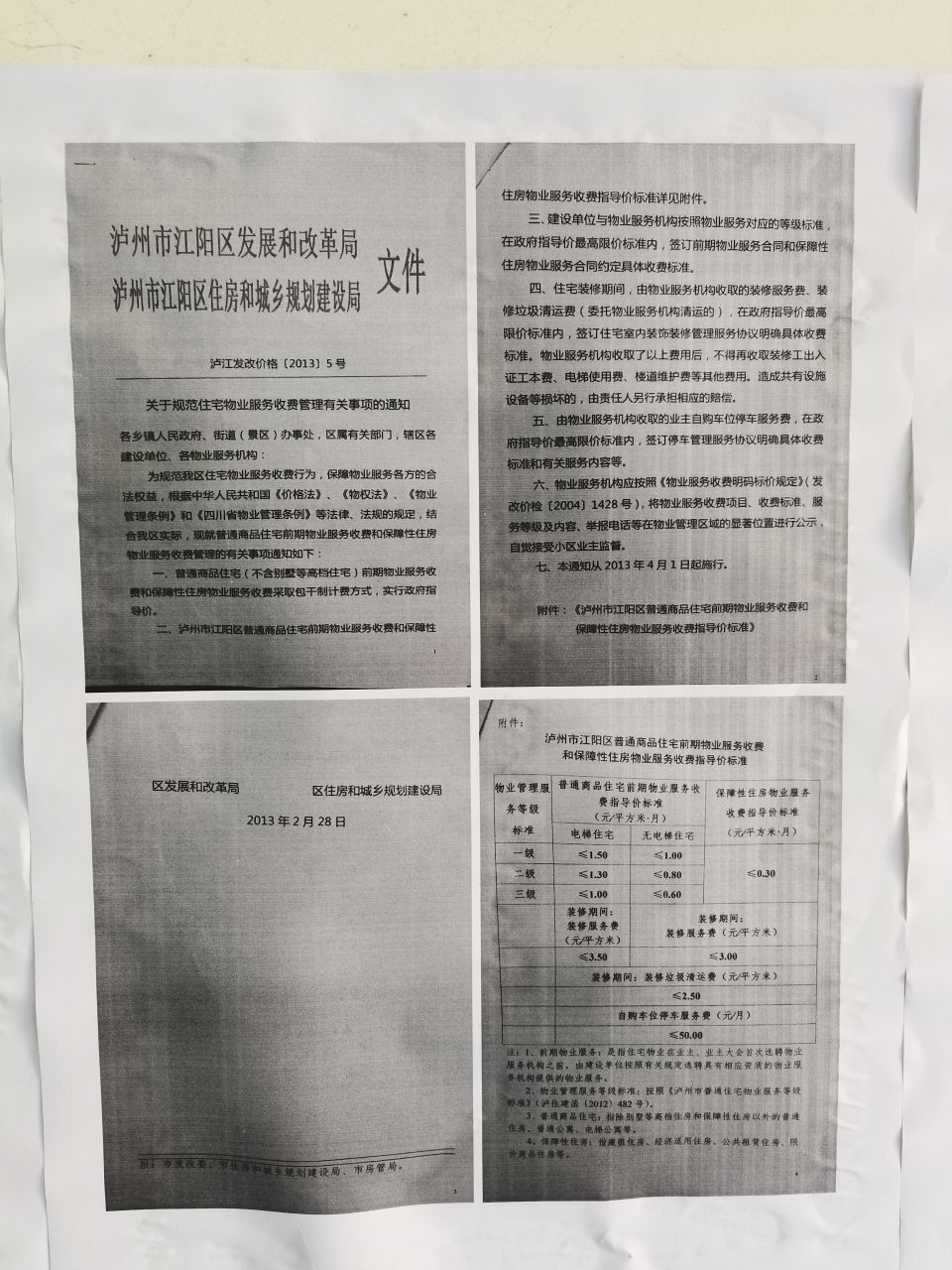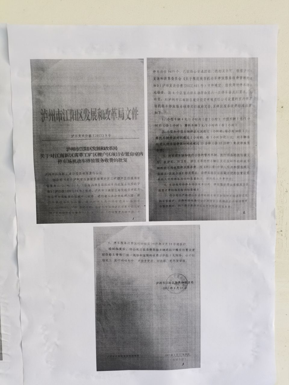 1. 东景物业根据《泸州市江阳区发展和改革局关于对江南新区茜草工矿区棚户区项目安置房室内停车场机动车停放服务收费的批复》泸江发改价格〔2017〕9号,区发改局只针对江南新区1、2、4、5、6、7区六个区作停放服务收费标准批复,并未对8区进行机动车停放服务收费标准批复,东景物业未取得江南新区8区机动车停放服务收费标准批复就公示地下停车场收费通知不合理。