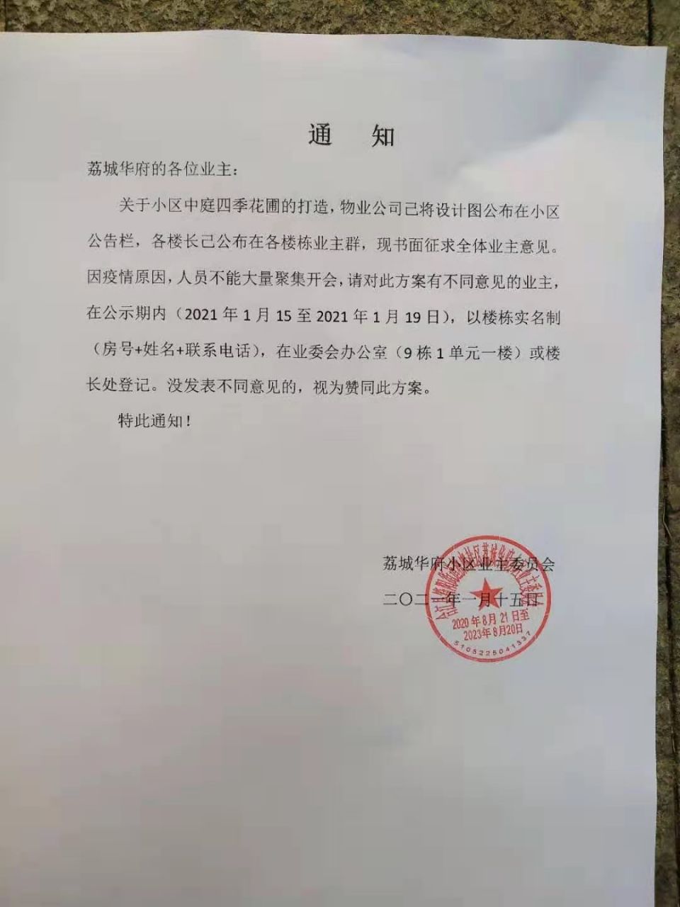 2021年1月15日,荔城华府小区业委会发出通知,对中庭公共绿地用地修建长廊征求意见,并以“未发表不同意见的,视为赞同此方案”为强势意见征集方式。