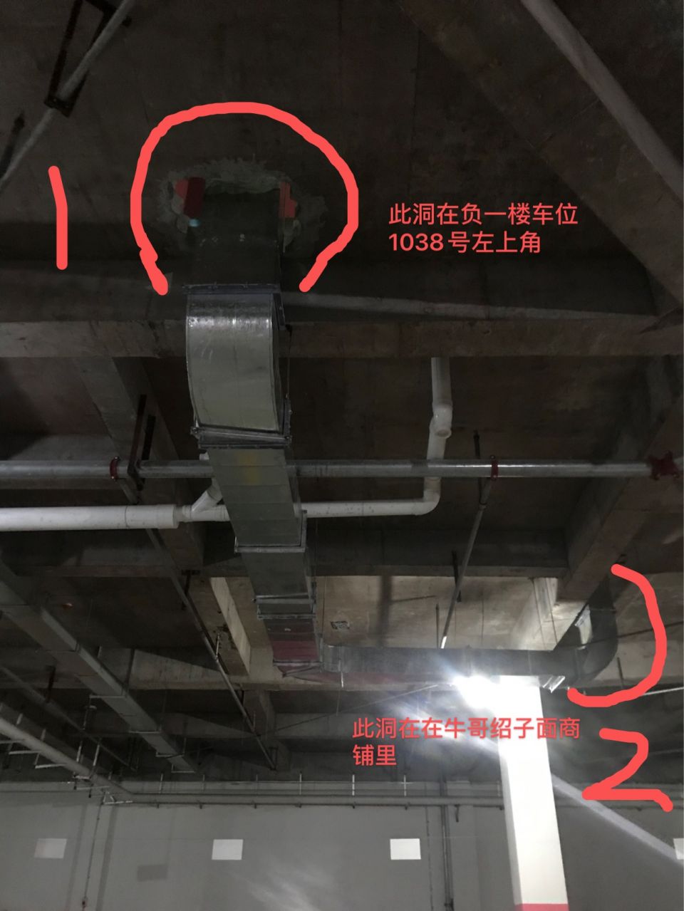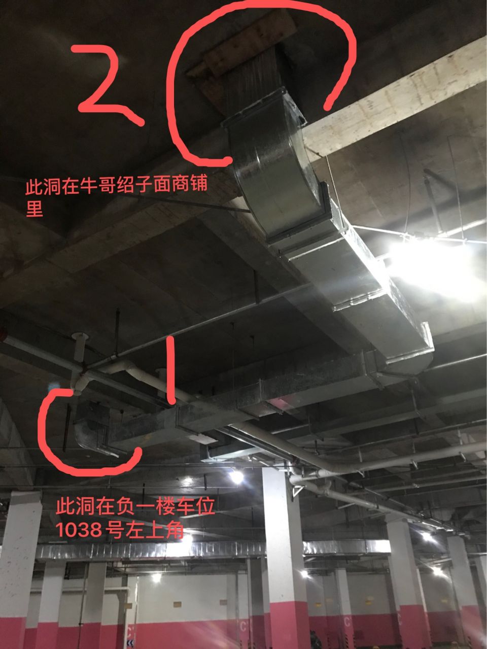 尊敬的各位领导,我是领秀新城的一位普通业主!前天偶然开车看见负一楼地下停车位1038号左上角楼板被私自打穿了一个大洞,并且安装了一个直径很大的一个不锈钢管道!后来我绕在前面商铺去观察!发现是华升南路102号商家牛哥绍子面打穿的楼板!并且还私自把自家楼板打穿,尽然是为方便自己安装排烟道!把负一楼楼板打穿两个大洞,一个在自家商铺里!一个在负一楼车位1038号左上角!