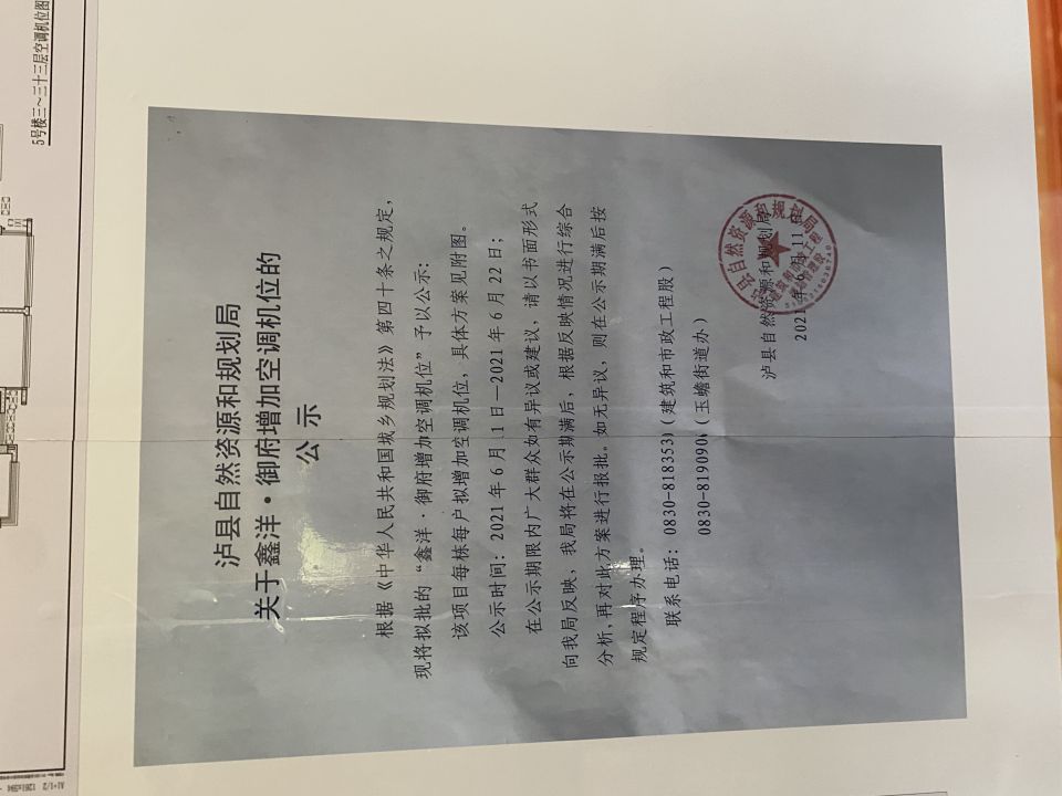 6月11日,开发商(泸县鑫金置业有限公司)就增加空调室外机位到我局办理相关手续。我局根据《中华人民共和国城乡规划法》第四十条之规定对其设计方案的总平图进行公示。根据业主诉求,我局要求开发商将公示内容延长至6月30日。同时,积极配合做好相关整改工作。