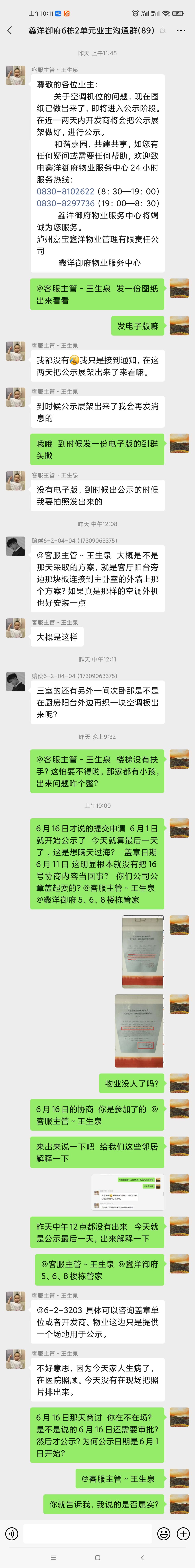的顺利施工。以上内容如图所示,6月21日中午12点左右,我向物业客服主管提问什么时候能出公示,客服主管的回复是,他只接到通知,