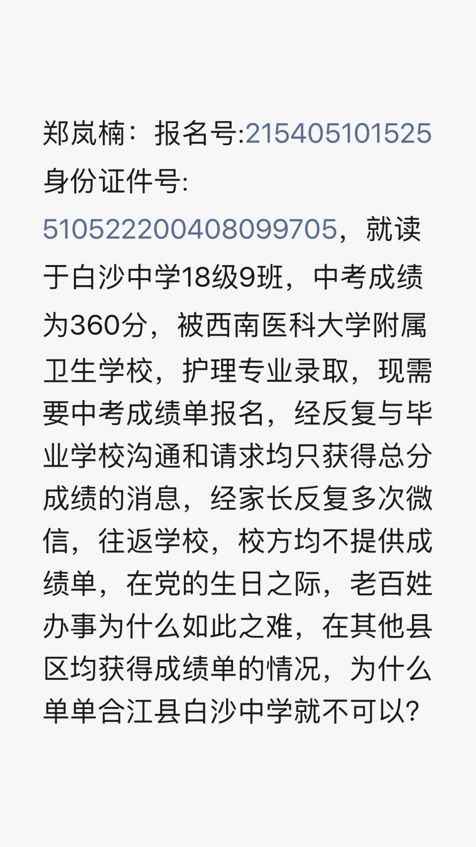 2021年6月28日,白沙中学初三学生郑岚楠及其家长到校咨询中考成绩,并要求学校为她开具中考成绩证明,因接待教师不知情况,告知他们可先找班主任。由于班主任已到泸州产检,电话告知他们记不清该同学的具体成绩,没在学校无法为其查询具体分数。随后他们咨询了正在负责招生的教师,接待处只有正取生和落榜生名单,告知其无法查询“中考380分以下的成绩”。下午白沙中学教务室为其查到了成绩,并告知他们各科得分及总成绩。