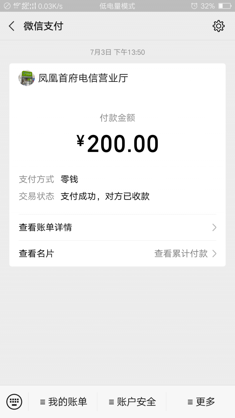 前几天在江南路四段(凤凰首府)122号中国电信开卡,预存200话费,实际店家只冲值100另外是系统赠送话费,是微信收费,也没有发票。店家说结果一样,但性质不一样,这种耍花招玩套路,把新卡优惠都变成他赢利的本钱了。我冲200就要冲200什么乱七八糟加一起200这不是欺诈消费者吗?事先也未告诉我,希望有有关部门规范管理下,不要消费者吃哑巴亏。