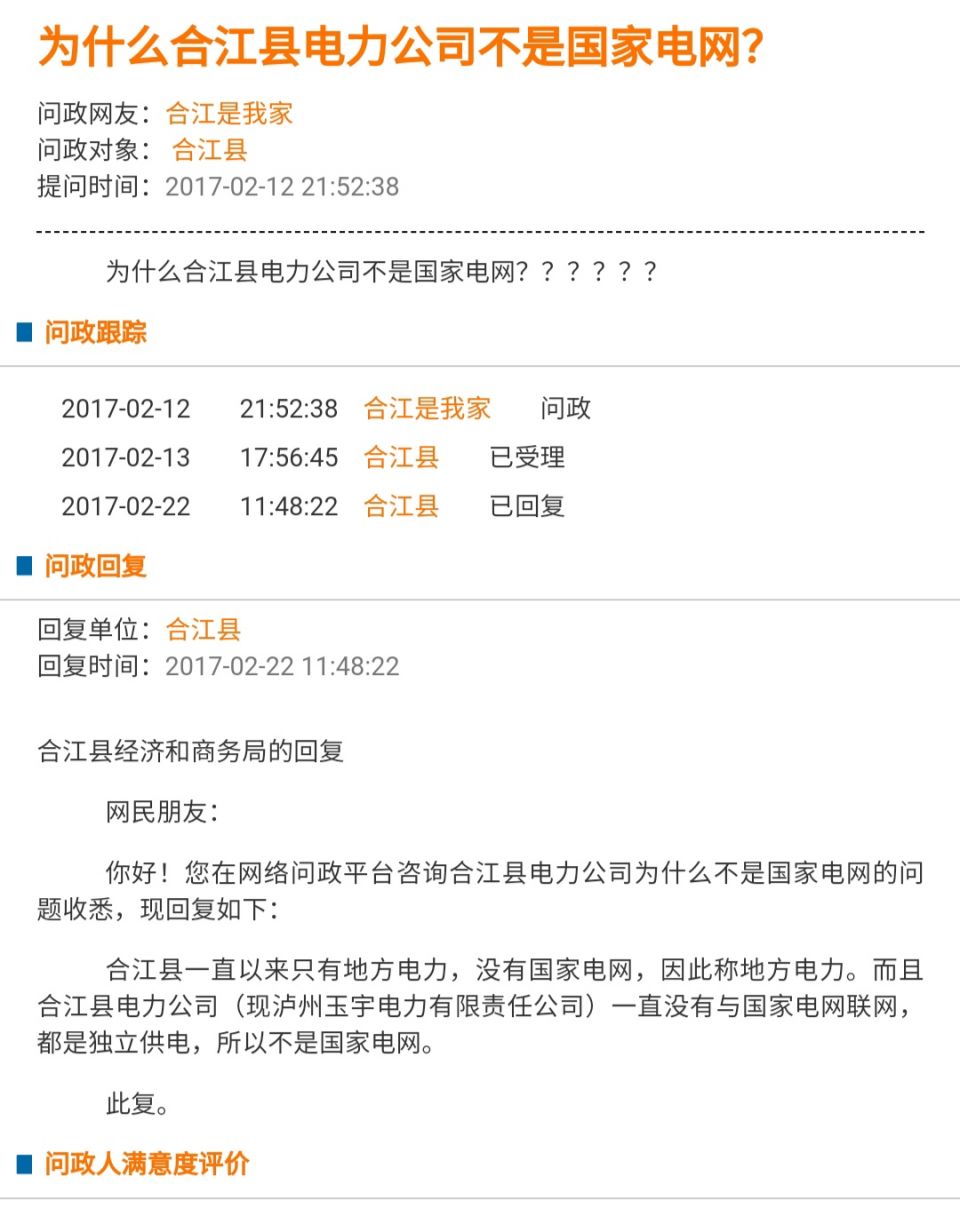 现在都换成智能预付费电表了,更是想怎么样就这么样,感觉就是,反正钱已经先收了,我管你那么多!太多的话想说,但是我知道,跟你们说了也没用,因为你们只会敷衍走形式!这次看你们怎么回复吧,同时我会记录每次停电的时间,如果你们不能好好的用心处理,那就让全国人民都知道,四川省泸州市有个叫合江县的地方,那里的老百姓连国家电网的电都用不着,三天两头停电。全国独一份!