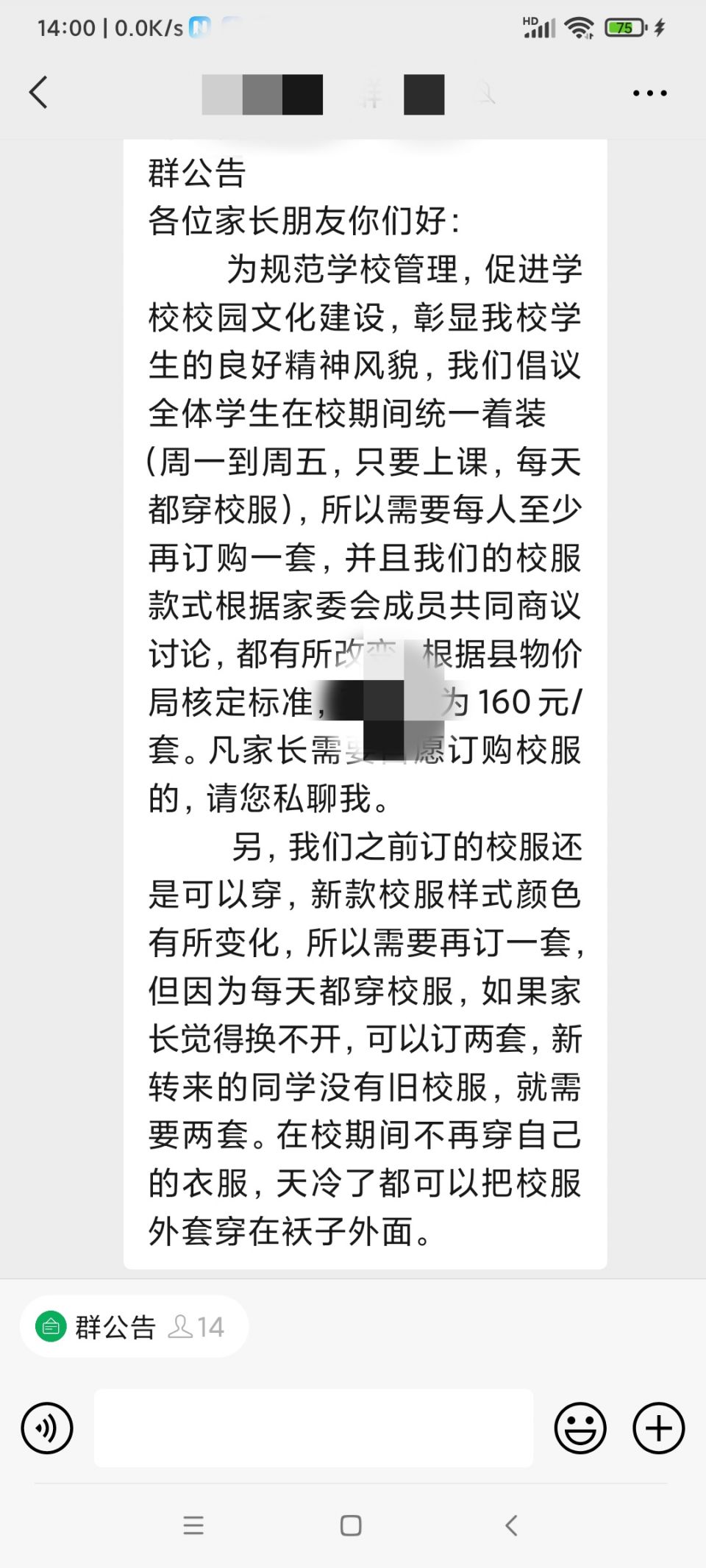 各位领导你们好,我是一个普通农民家庭,近期收到潮河镇学校关于更换校服的通知有很多疑问,学校说有助于校园文化经过家委会决定需要更换校服样式,我想问几个问题,第一:为什么上半年才让买校服下半年就又说样式不行要换 第二:家委会是什么时候有的,有那些人参加 第三:县物价局定价160一套有没有公示,一个家委会就能决定校服样式不行,当初干嘛去了,是不是过两年又换一个样式,谁给了这么大权力,乡镇教育乱象何时是个头,清楚记得我读书时候的危房经过加固现在还在用,为什么不把有限的资源投资在硬件建设和教育力量上呢?大多都是农民家庭和打工家庭经不起这样折腾!希望有关部门能够高度重视,真正让这些乡村娃儿通过努力学习翻身!形式主义还是少搞一点!