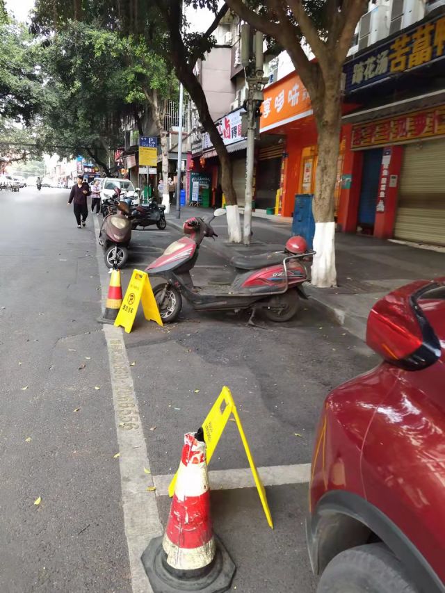 仁和路街边的停车位,长期被这几家商家用烂摩托车占用
