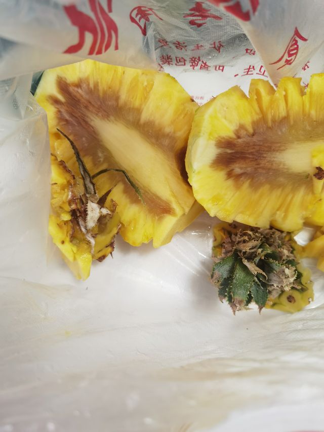 我在2022年3月20日上午10点过几分,在叙永镇御景东城楼下的花果山副食店购买菠萝,老板在削皮过程中发现菠萝底部很长一截已经坏掉(他已经削到坏的那个位置了,那里已经烂成浆了),所以他没有切掉头部和底部,叫我回家自己削,我觉得也不麻烦就答应了,回家切开发现菠萝从底部开始,整个心全是黑的,又坐车来回去找他,他只赔偿菠萝钱