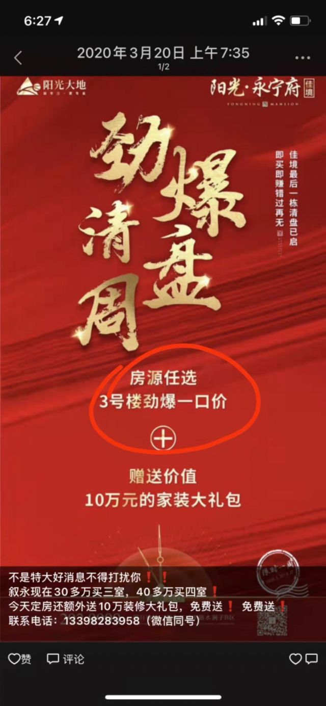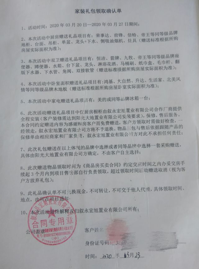 叙永县阳光大地百强企业在2020年3月为了卖房跑量,虚假宣传10万家装大礼包,2021年11月交房,业主多次到售楼部找开发商,开发商才把家装 大礼包发放给业主,但产品没有清单,没有价格,30多个平米的木地板才800元,全部礼包价值就一万块左右,但是送的东西根本就用不着,质量简直不可想象,完全是欺骗消费者,如果不是有这个10万家装礼包我们就不会买这里的房子,