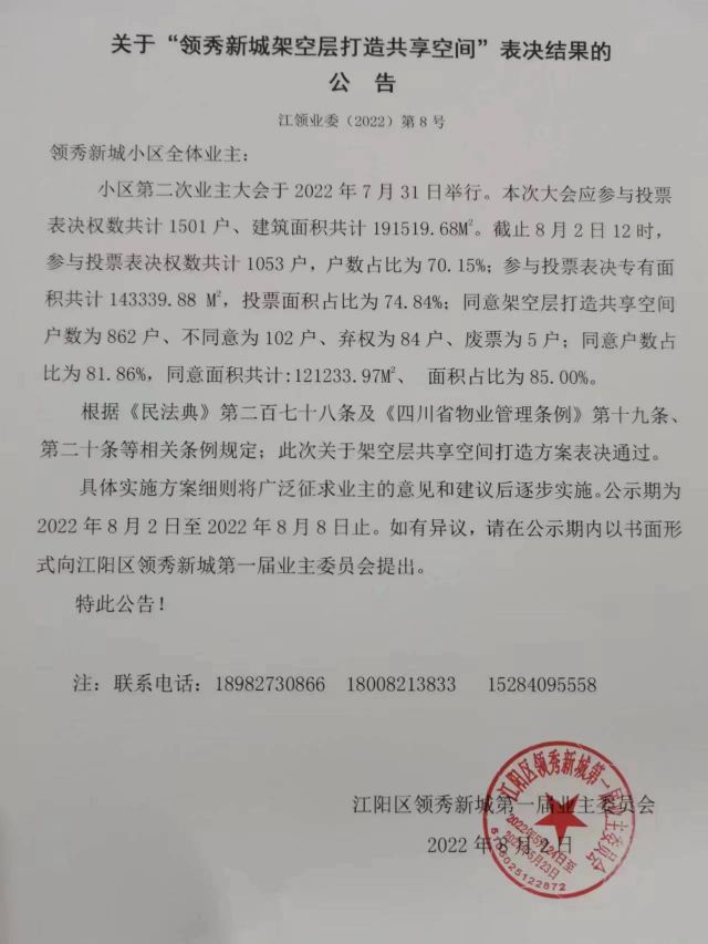 2022年8月3日,街道、社区搭建平台,组织小区业主委员会、物业公司负责人(架空层打造出资方)就小区架空层打造票决问题进行座谈。座谈中,华阳街道、龙腾社区明确告知业委会及物业公司,按照《民法典》、《四川省物业管理条例》等相关规定,架空层的利用和打造要在符合消防和公共空间使用相关规定的前提下,制定详细方案进行公示并充分征求业主意见后方能决定。鉴于部分业主对架空层是否打造持有不同意见,业主委员会及物业公司现场明确表示将暂缓架空层打造事宜,双方分别于2022年8月4日、2022年8月5日在小区张贴了《领秀新城架空层打造共享空间情况说明》、《关于领秀新城架空层不再打造的说明》的告知书,告知业主如需打造架空层,将依照程序重新制定方案并公示表决。