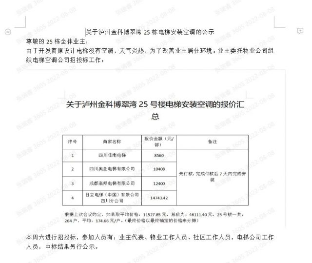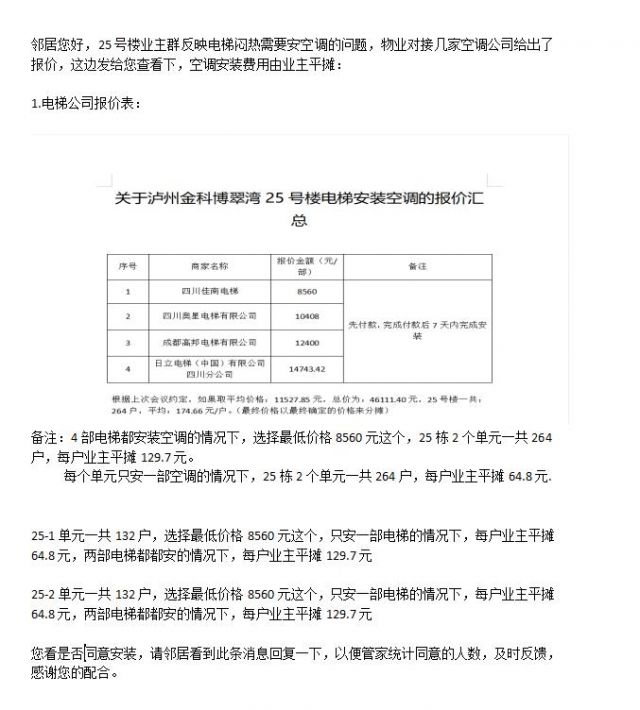 住建局您好,我是金科博翠湾25号楼业主,目前金科博翠湾25号楼两个单元4部电梯因部分业主要求在楼栋电梯里安装空调一事委托金科博翠湾物业进行空调招标,对此,我又有几个疑问: