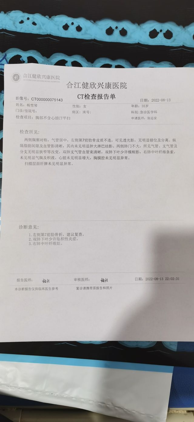 2022年8月13日晚21时许,杨雪琴及其家人在荔江镇柿子田村观景台玩耍期间,因夜晚风大,杨雪琴被大风吹倒的观景台展板砸伤。伤者杨雪琴被及时送至合江县健欣医院住院治疗,经医院诊断,杨学琴左前方第七肋骨骨折。