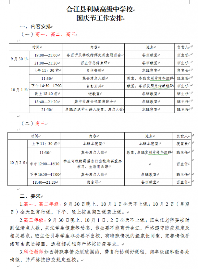 合江县利城高级中学校学生多来源于川黔渝等周边省市县,目前这些地方及泸州周边地区仍存在疫情中高风险地区,防疫形势仍然严峻,且国庆假期人员流动大,疫情防控难度大。合江县利城高级中学校于9月20日开始开学,入学时间短,因此,为避免放假后及返校途中可能出现的学生间疫情传播,影响节后正常教学秩序,合江县利城高级中学校决定让学生就地过节。并且,利城高中已安排高一、高二学生于10月1日在校休息,高三县外居住学生于10月1日与10月2日在校休息,县内居住学生于10月1日与10月2日放假两天。如因特殊情况确需离校的,请向学校请假。