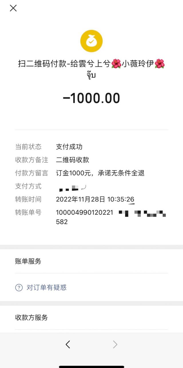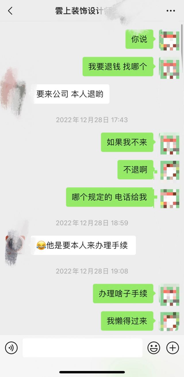 去年11月我在雲上装饰(城西店)交了1000元订金,发票写着无条件退款,并未签订装修合同。现因装修事宜推迟,想拿回订金,公司领导以需亲自上店签字为由,不退。我的订金是通过微信转账付的,人在外地,实属不方便特意来泸州。我也委托了该公司的设计师(收订金的人)帮我签字,转账给我,可该公司领导不同意,非要我本人来签字,我不明白这样有何意义。请市场监管部门的各位大佬帮帮忙,督促雲上装饰公司退还订金。