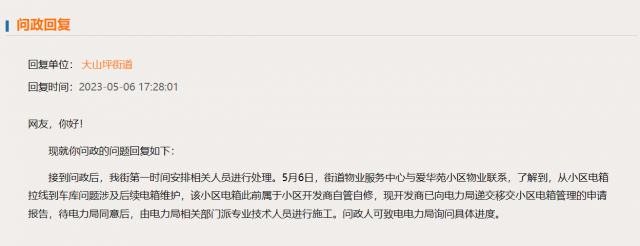 经核实,爱华苑已于5月15联系供电公司,同意对该小区车库充电桩电源进行业扩配套施工。