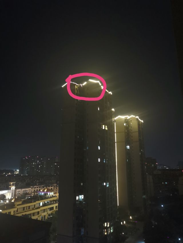 位于南岸花城路边的第一栋房子楼体的城市灯光工程,图内红色圈内的灯具坏掉,每晚开启灯光后一直闪,晚上是大家休息的时间,一直闪烁的灯光晃得春天里几栋楼的人没办法睡觉,希望能及时修复,或者不开。