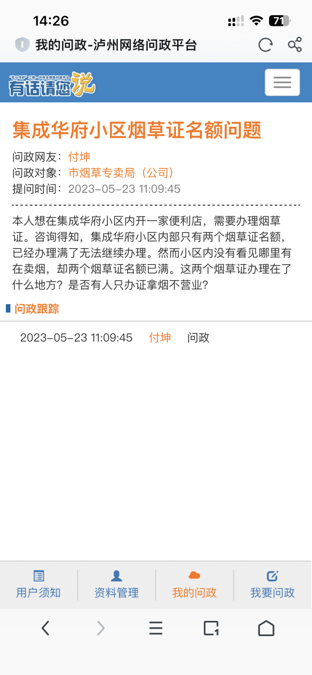 您好!关于您5月23日通过市网络问政平台向我局(公司)提出的关于“集成华府小区烟草证名额问题”的咨询,由于当时我局(公司)投诉经办人的手机未收到网络问政平台关于此笔咨询的提醒短信,因此未能及时接收到您的诉求,在此表示万分歉意,目前已要求下级单位对您的咨询进行了回复,请您谅解我方工作失误。