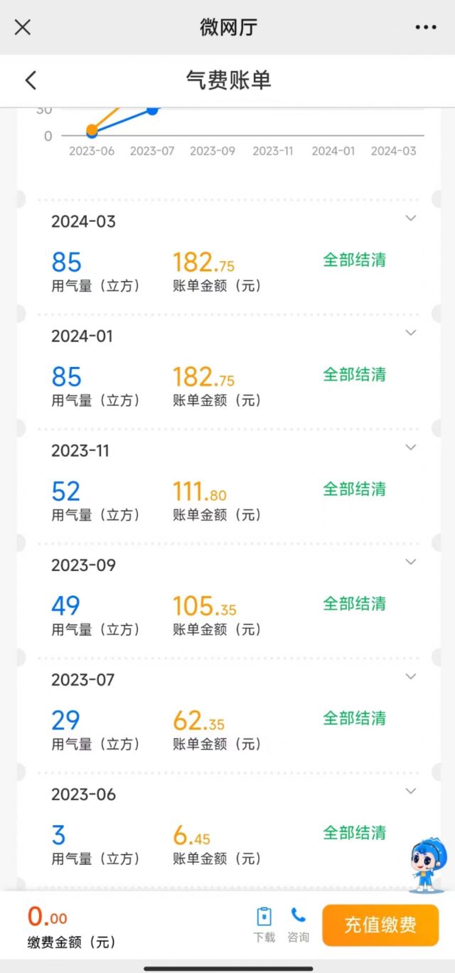 6月底搬家过来,7月开始每个月都是二三十方的用气量,后面改为两个月一抄表,也只有五六十方用气量(之前是租房,也差不多是这个用气量);但2023年底开始,在家里同样人数、同样生活方式的情况下,为何就上涨为八九十方用气量了,上涨30%多;而且2023年11月-2024年1月和2024年1月-2024年3月用气量不约而同的都是85方,金额都是182.75,是巧合还是什么情况呢?