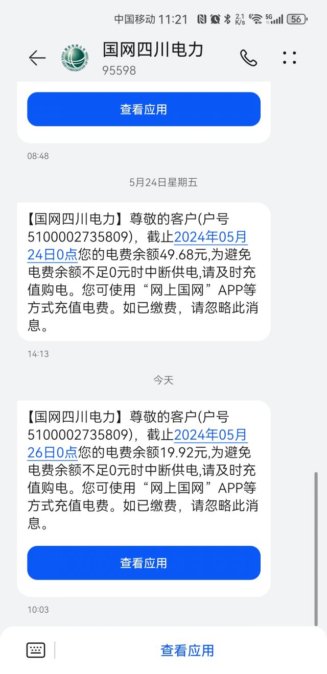 24日和25日共计使用电量64.05度,合计电费为29.76元,与问政人短信提示扣除电费29.76元一致。