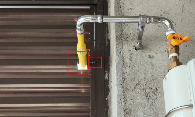 1、31和33号楼:(1)燃气表安装的墙体靠近栏杆处为边长20cm的结构立柱,起承重作用且内置钢筋笼无法开孔,距离墙边40cm处设置有洗衣机的电源插座,依据燃气相关规范“燃气表距离电源插座的水平净距不应小于20cm”,故无法从该墙体直接开孔入户,只能从墙体侧面栏杆上方绕行安装燃气管道入户;(2)该位置为封闭的生活阳台,天然气设计和安装时已要求开发商将燃气管道穿过的玻璃窗户改为百叶窗,为保证安全用气,此处百叶窗严禁改为玻璃窗进行封装。