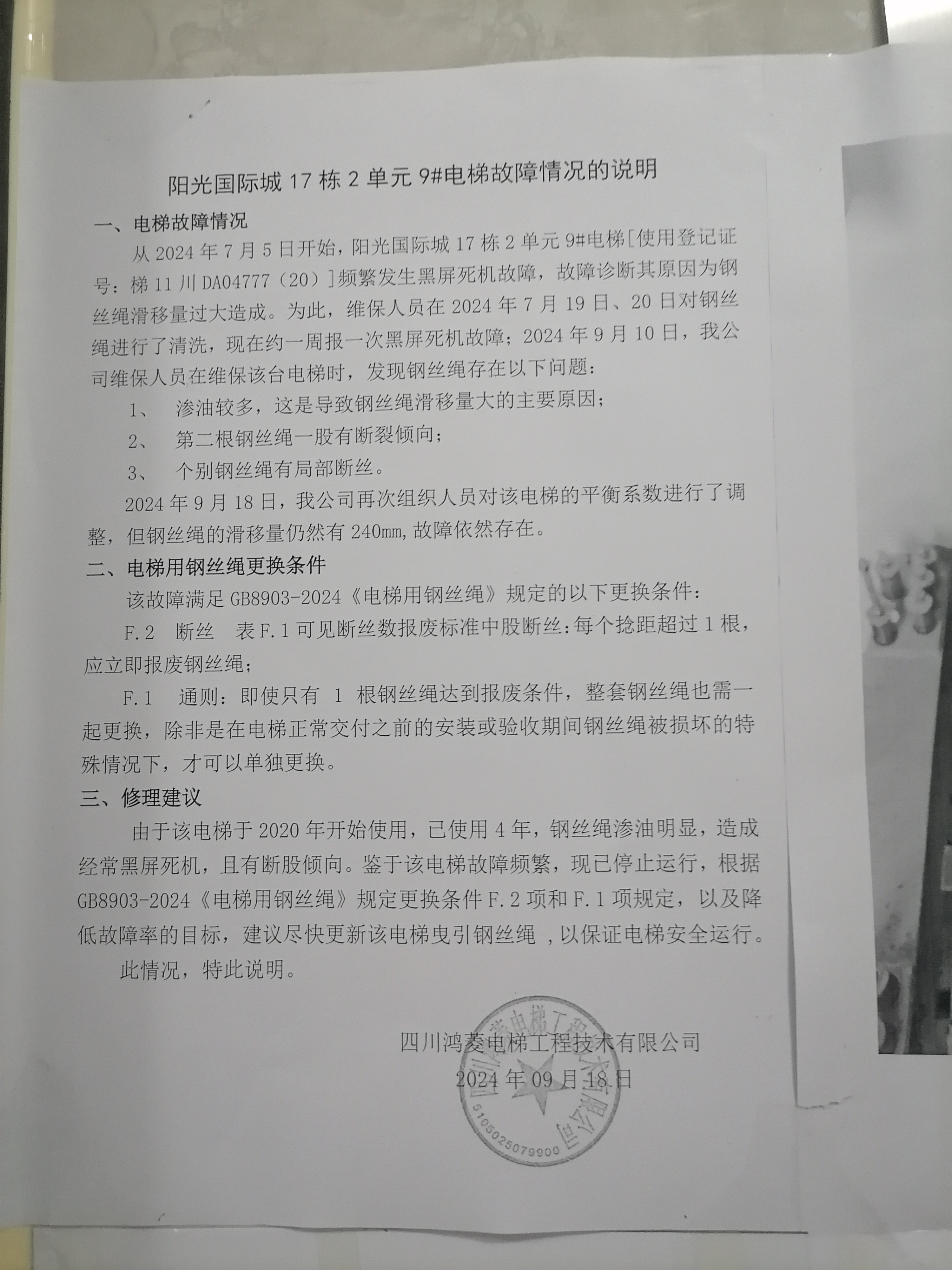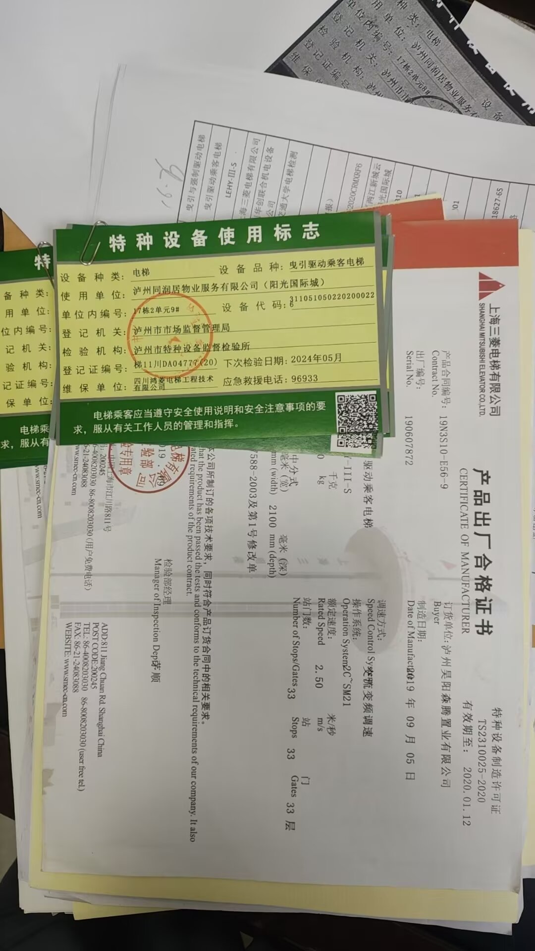 9月24日,经现场调查,17号楼2单元9#电梯使用单位:泸州同润居物业服务有限公司,维保单位:四川鸿菱电梯工程技术有限公司,电梯使用登记编号:梯11川DA04777(20),设备代码:311051050220200022。该电梯制造单位名称:上海三菱电梯有限公司,制造日期:2019.09.05,施工单位名称:溧阳市飞达电梯安装工程有限公司,监督检验日期:2020年5月28日,上次检验合格日期:2024年6月。