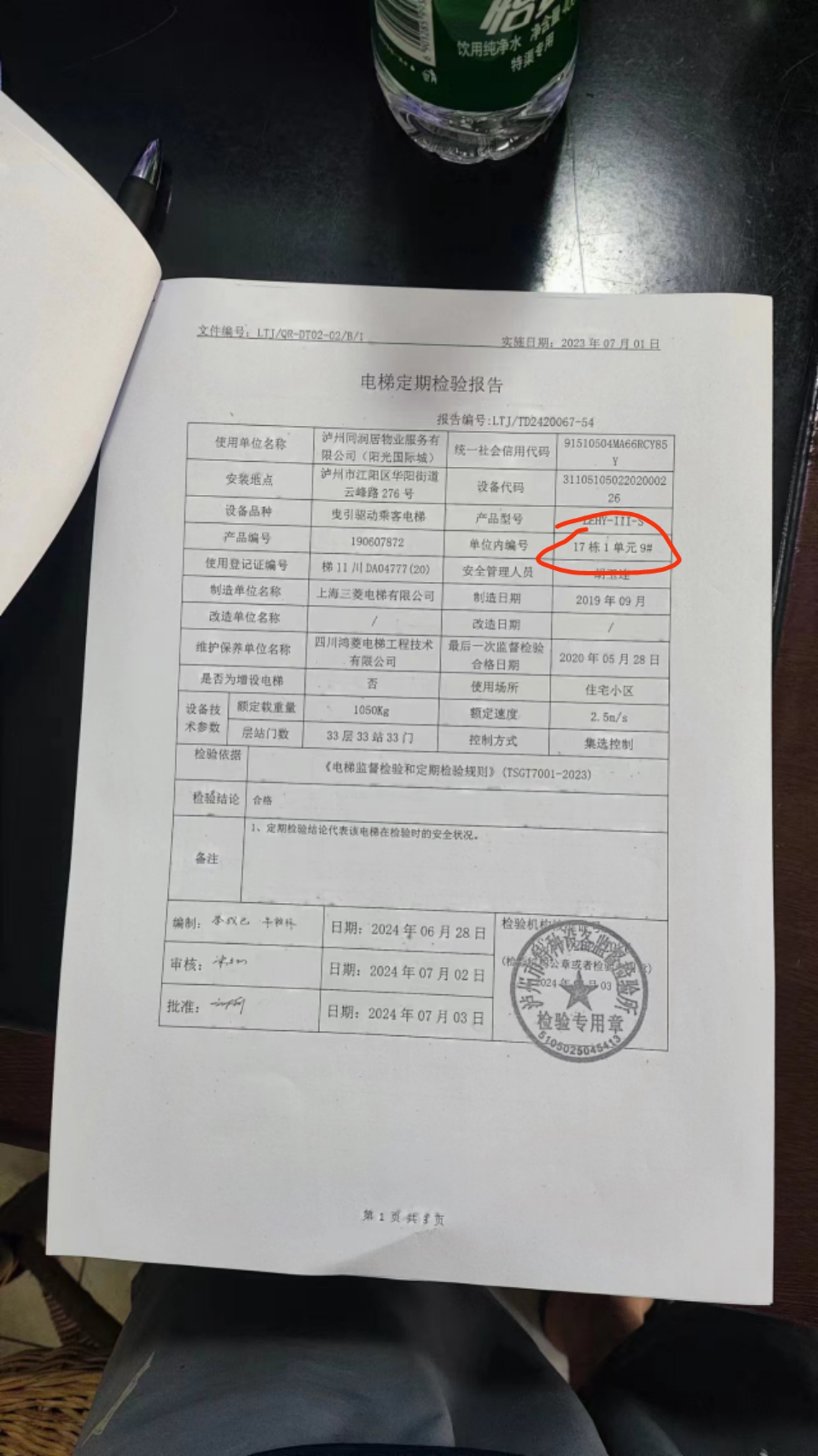 3、阳光国际城17号楼2单元电梯使用登记证书、定期检验报告和维保记录以及年检记录的标的物不一致,该部电梯资料显示属于17栋1单元,而实际却安装在了2单位,该电梯工程存在严重问题,请住建局予以调查处理,给老百姓一个安全的出行环境。