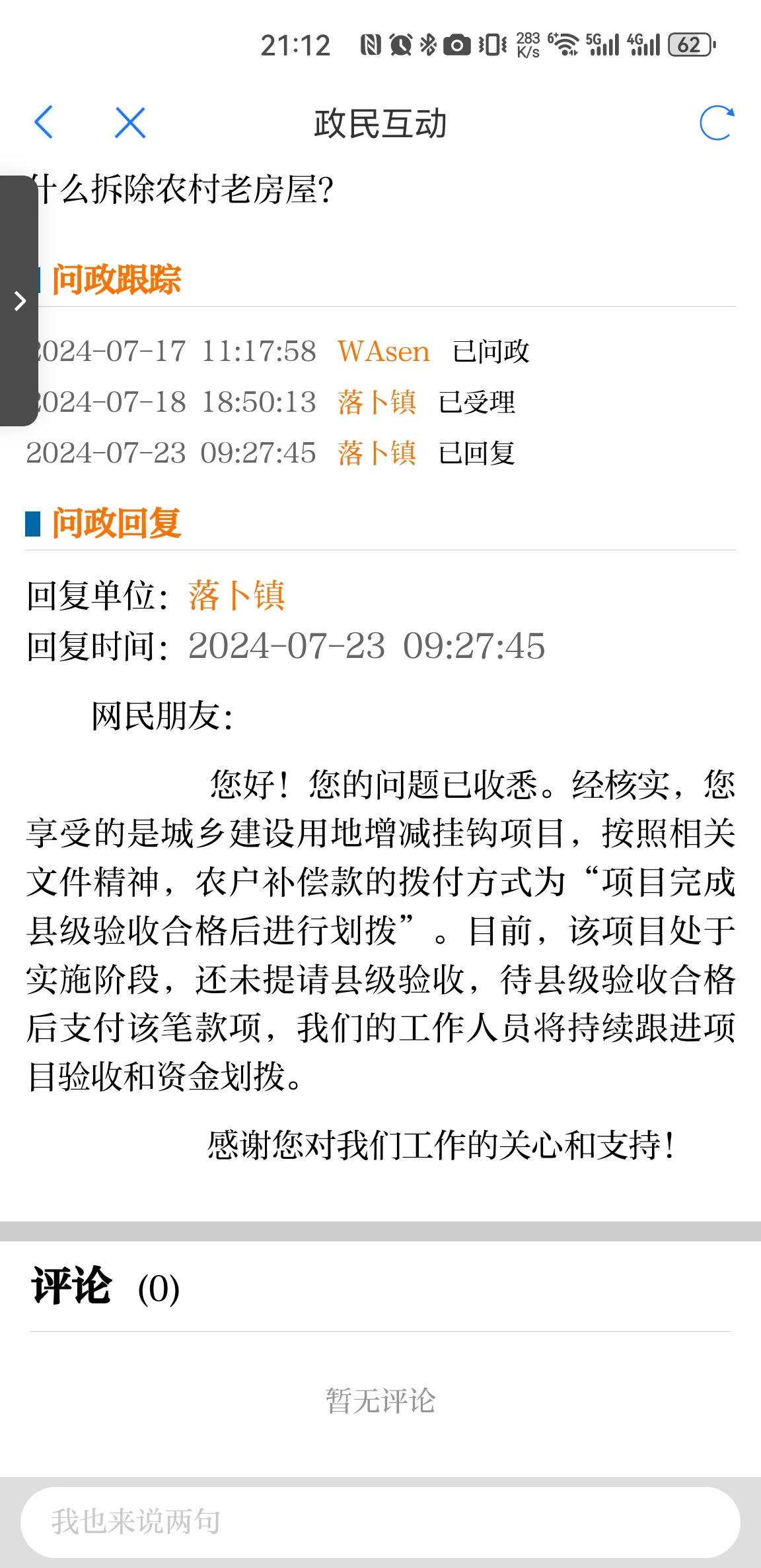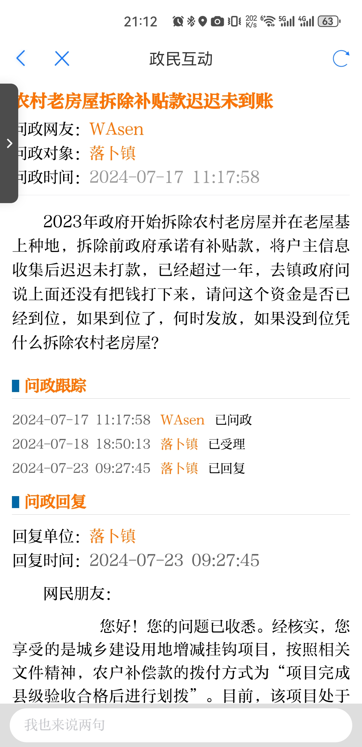 您好,您的问题已收悉。您于7月17日通过“有话请您说”网络问政平台反映“农村老房屋拆除补贴款迟迟未到账”问题,我单位于7月23日答复“您享受的是城乡建设用地增减挂钩项目,按照相关文件精神,农户补偿款的拨付方式为‘项目完成县级验收合格后进行划拨’”。12月13日,您再次通过“有话请您说”网络问政平台反映该问题。我单位于12月18日再次认真调查核实,现将处理情况回复如下:
