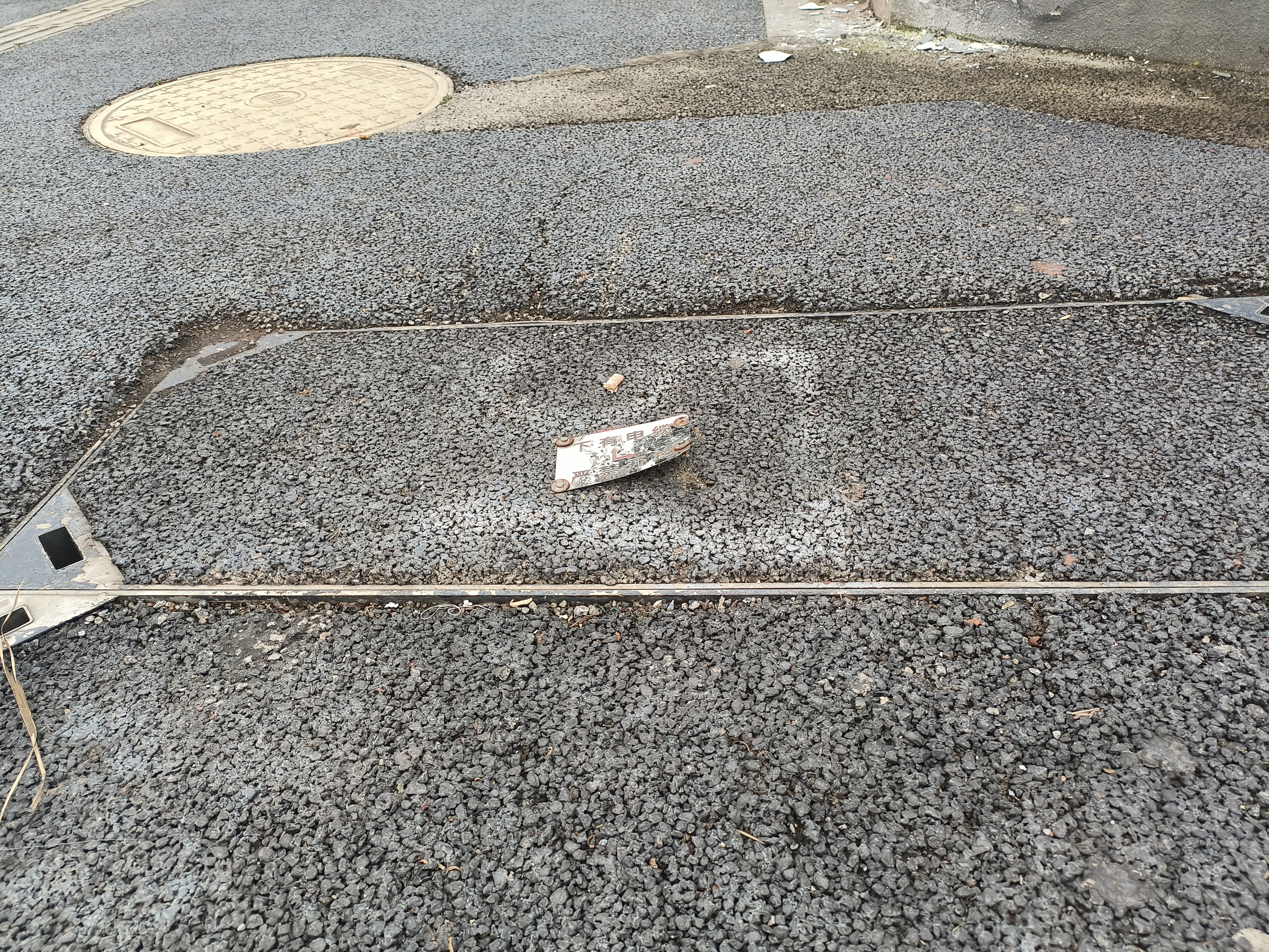 人民南路幼儿园华美路分园和四川水文交叉路口的线缆警示牌一个角的螺丝脱落已经有一段时间了,警示牌翘起很危险!孩子们上学放学容易踢到受伤