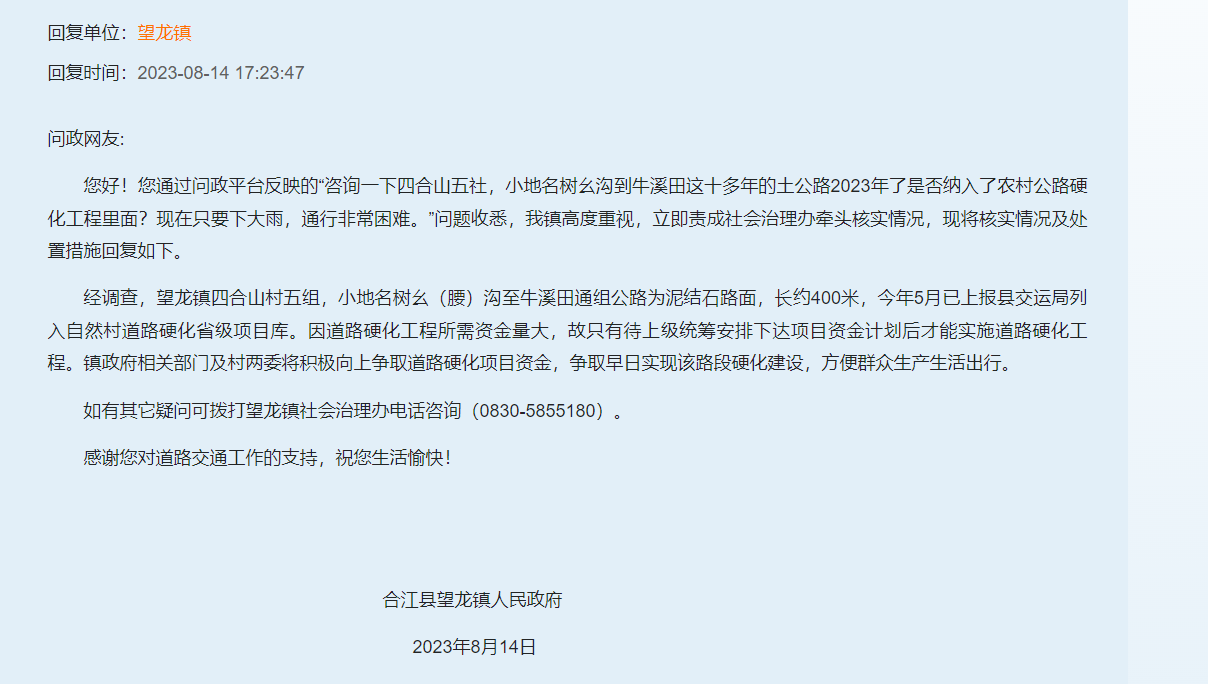 经调查,望龙镇四合山村五社,小地名树幺沟到牛溪田通组路为泥结石路面,长约447米。道路硬化工程所需资金量大,只有待上级安排下达项目资金计划后才能实施道路硬化工程。经镇政府及村两委多方积极争取,县交运局已同意将该通组公路列入2025年农村公路硬化项目实施计划,具体实施时间要以上级部门统筹安排计划为准。