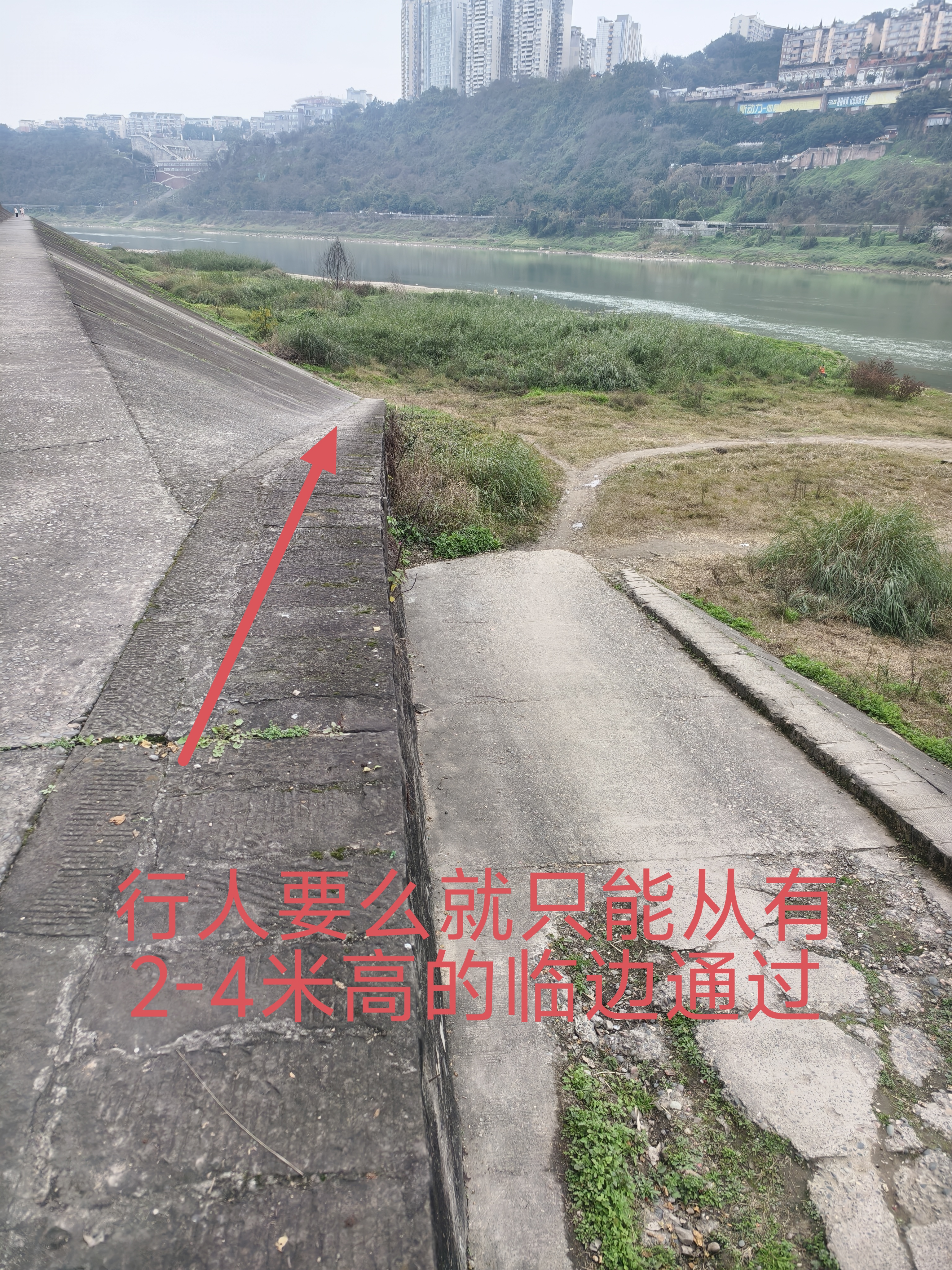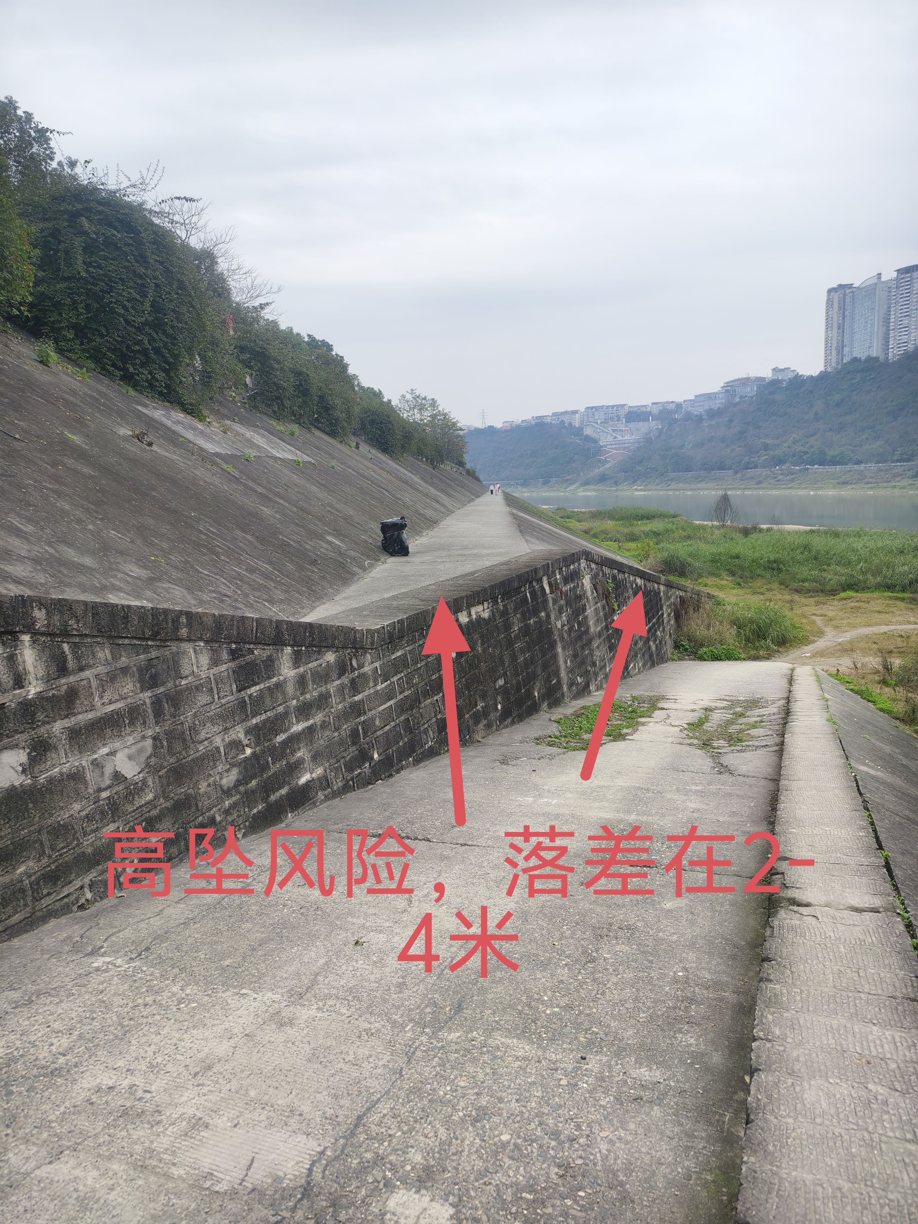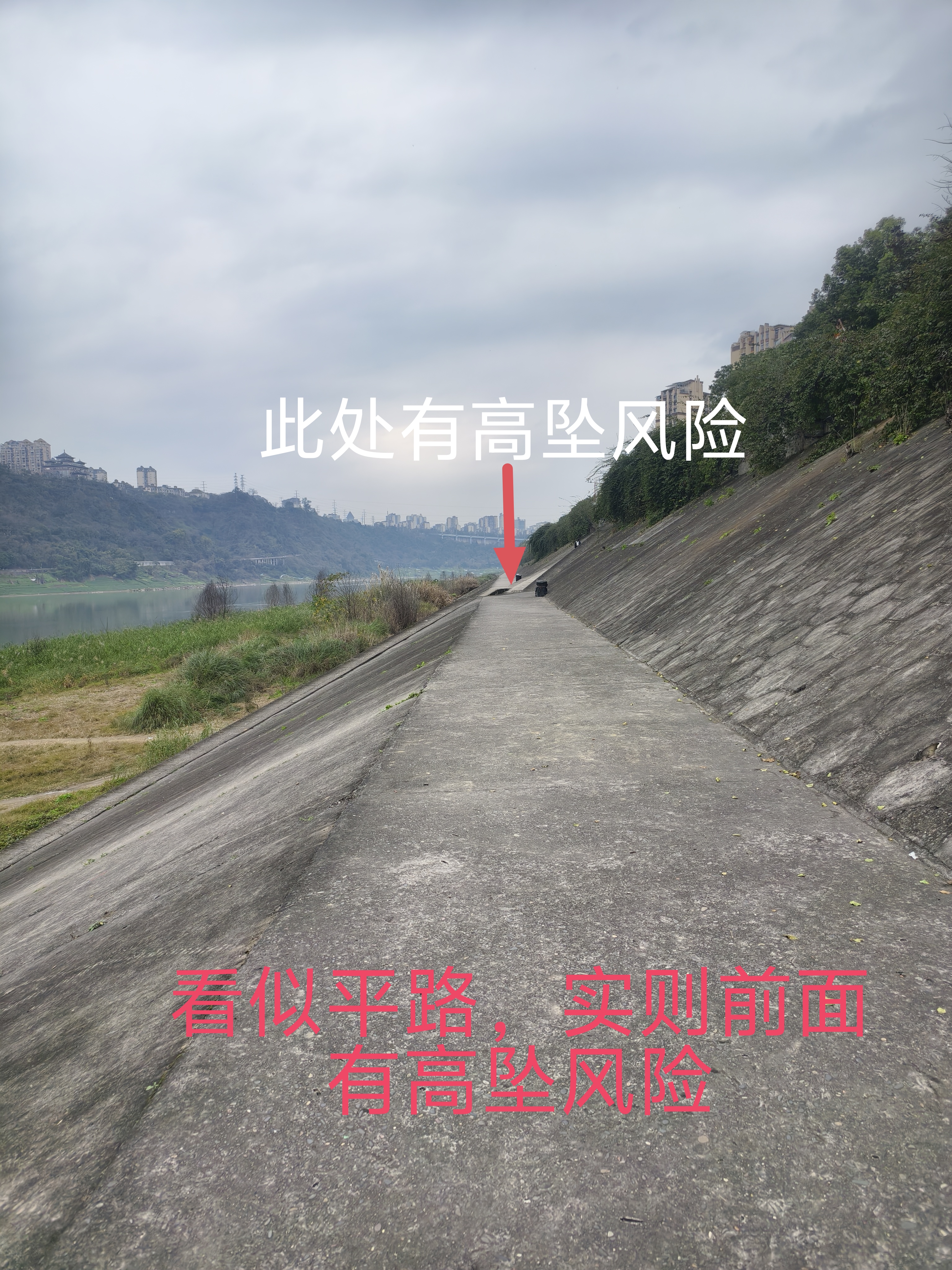 龙马潭区杜家街天立外滩一号3期,河边健身器材外侧河边,有一条休闲步道,存在严重高坠风险,如果行人不慎从此处坠落,轻则受伤或骨折,重则可至死亡。
