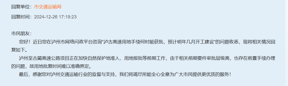 您好!感谢您对泸州交通发展特别是高速公路规划建设的关心。您通过网络问政平台反映“泸古高速到底何时修建”的问题已收悉,现将相关情况回复如下。