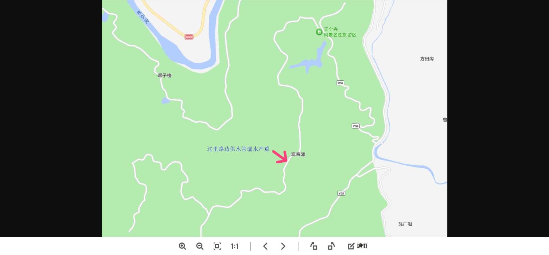 前几天,我去天仙硐溜达,发现从山顶到林场公交站之间的下山公路右侧,有一处自来水管破裂,大量自来水哗哗流出,从现场情况看,应该漏了一段时间了。看漏水情况,估计1小时会漏1.5m³的水,1个月估计要漏1000m³水,还是一笔不晓的损失,建议水公司派人去查看并维修一下。具体漏水位置和漏水情况见附件。