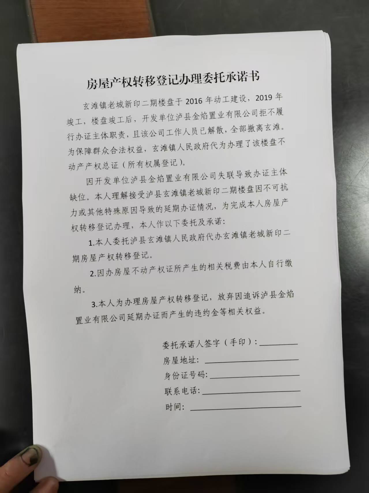 2、根据合同约定泸县金焰置业有限公司具有给业主办理不动产权证义务,但开发单位拒不履行办证义务且长期处于失联状态。为保障群众合法权益,玄滩镇人民政府代为办理该楼盘的不动产权证。经多方努力,老城新印二期已完成首次产权登记(总证)工作,目前正在开展产权转移(小证)工作。因在办理不动产产权转移过程中必须加盖泸县金焰置业有限公司公章,由于该公司已失联,无法履行相关法定义务。玄滩镇人民政府为保障业主权益,主动承担办理产权转移的相关工作,无权承担因开发商延期办证而产生的任何违约责任。为推动办理产权转移登记工作,需与业主达成不追诉延期办证而产生的相关违约金的协议。业主有权按照与泸县金焰置业有限公司签定合同进行相关法律诉讼。