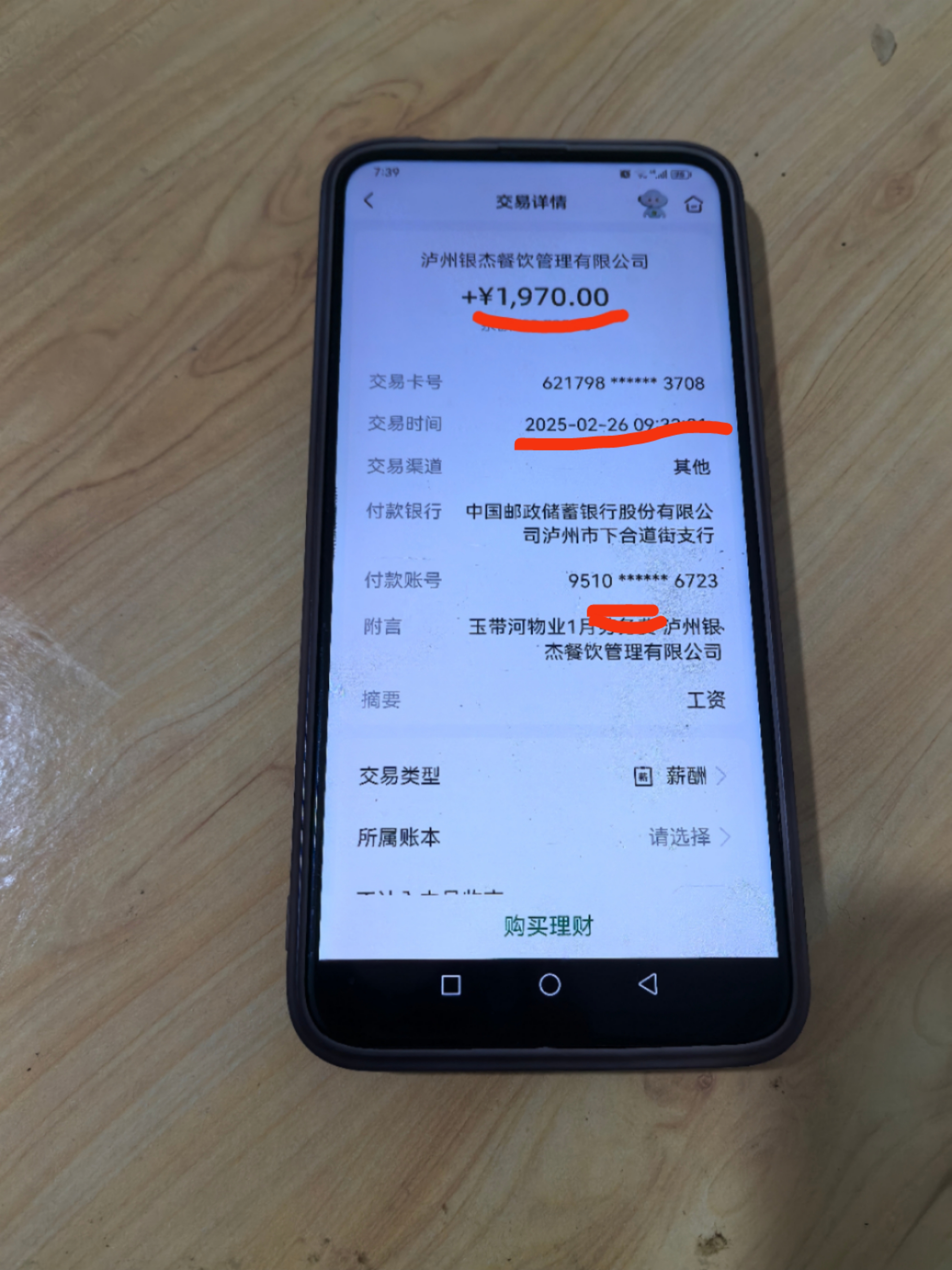 文件规定从25年1月1日起执行,贵司(泸州银杰餐饮管理有限公司)连续2个月都未执行,工资跨月发放的,3月25日收到2月工资还是1970元,请相关部门落实,下图为工资流水。