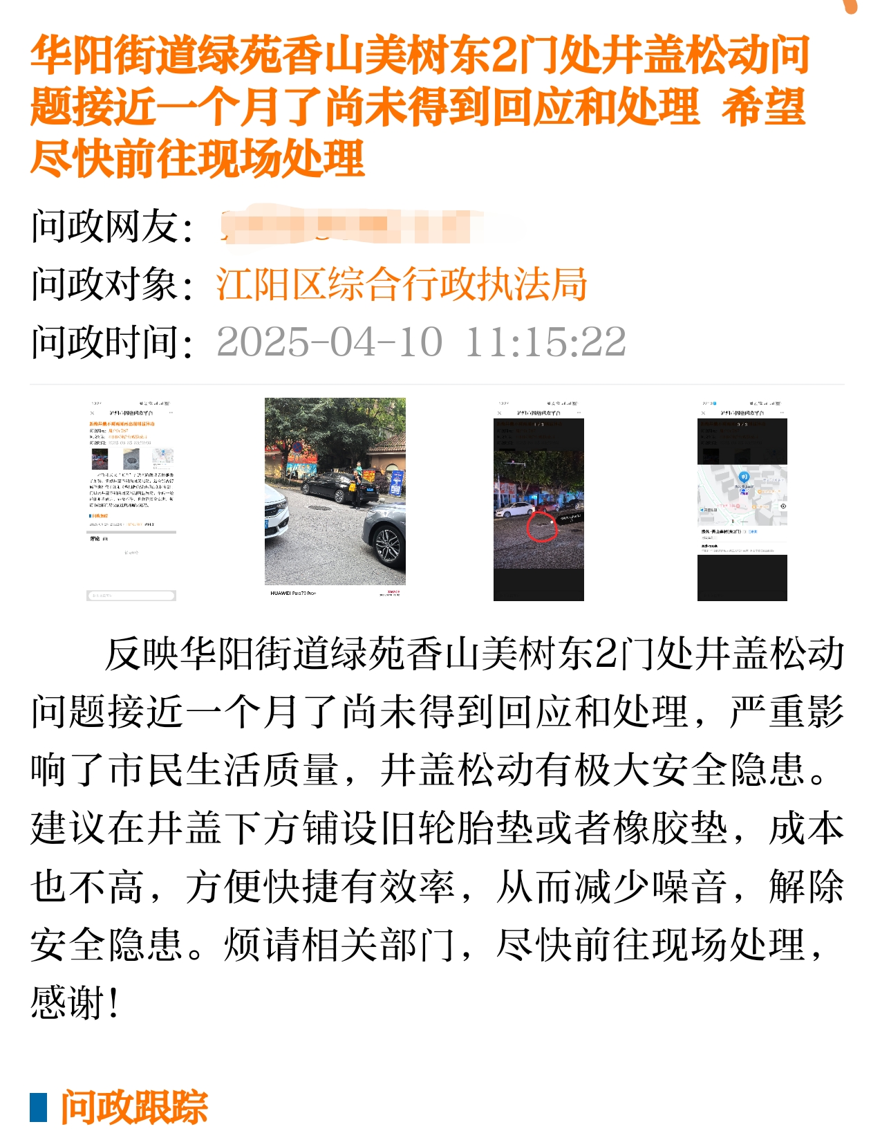 近日本人在网络问政平台反映的井盖松动问题得到了江阳区综合行政执法局的线上回复,但其实线下并无施工人员来此处垫放橡胶垫,井盖松动异响声依然如雷贯耳,车辆经过便咚咚作响,安全隐患也未解决,可前往现场核实!关于贵部门回复开发商未移交该地段给城管部门,本人实在不清楚,只看到井盖上面印有“中国市政”字样,故只能求助贵部门,恳请相关部门尽快赶往现场垫放橡胶垫或者旧轮胎垫消除安全隐患,不胜感激!