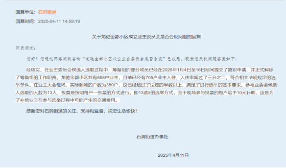 关于龙驰金都成立业主委员会流程是否合规合法问题的回复