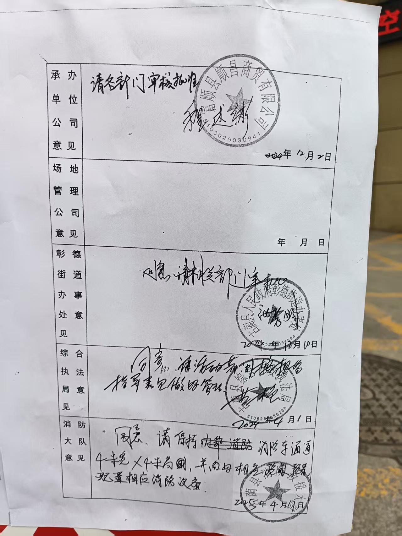 展销多次在府河新城敬酒春小区大门口摆摊,影响小区业主正常出行生活,各单位在商户申请时是否考虑到该小区群众生活出行受到影响,车库内发生火灾另一侧车库出入口狭窄,是否能够车辆及人员及时撤离。展销期间人员复杂,展销人员混进去小区出问题怎么办?为什么我们县有好几个广场不能去广场上搞?请审批单位彰德街道,综合执法局,消防大队,公安局,治安大队,应急管理局,商务和经济合作局回答一下。还有一个点,刚刚我看了许可期限是2025年4月30日至2025年5月15日。那么现在就开始封路,那么是不是违法了?
