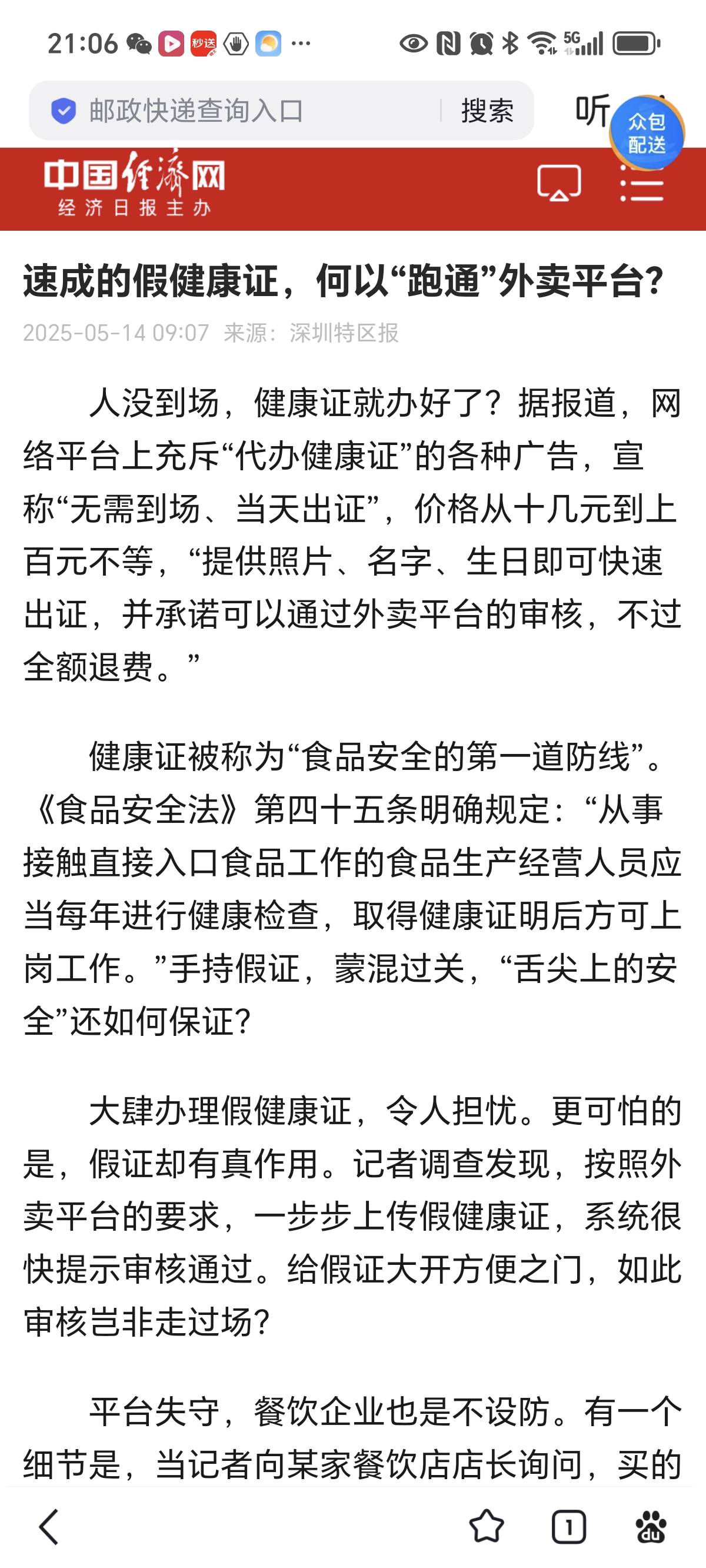 泸州市外卖行业使用假证十分泛滥。希望相关部门加强执法处罚力度,特别加强对京东,美团,饿了么等大平台从业人员使用假健康证加大查处,维护公众健康,让健康证真健康。
