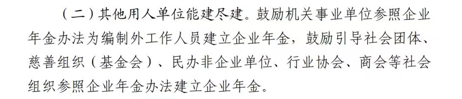 此《意见》在第二项-目标任务-第二条,明确其他用人单位能建尽建。机关事业单位为编制外的工作人员缴纳企业年金。
