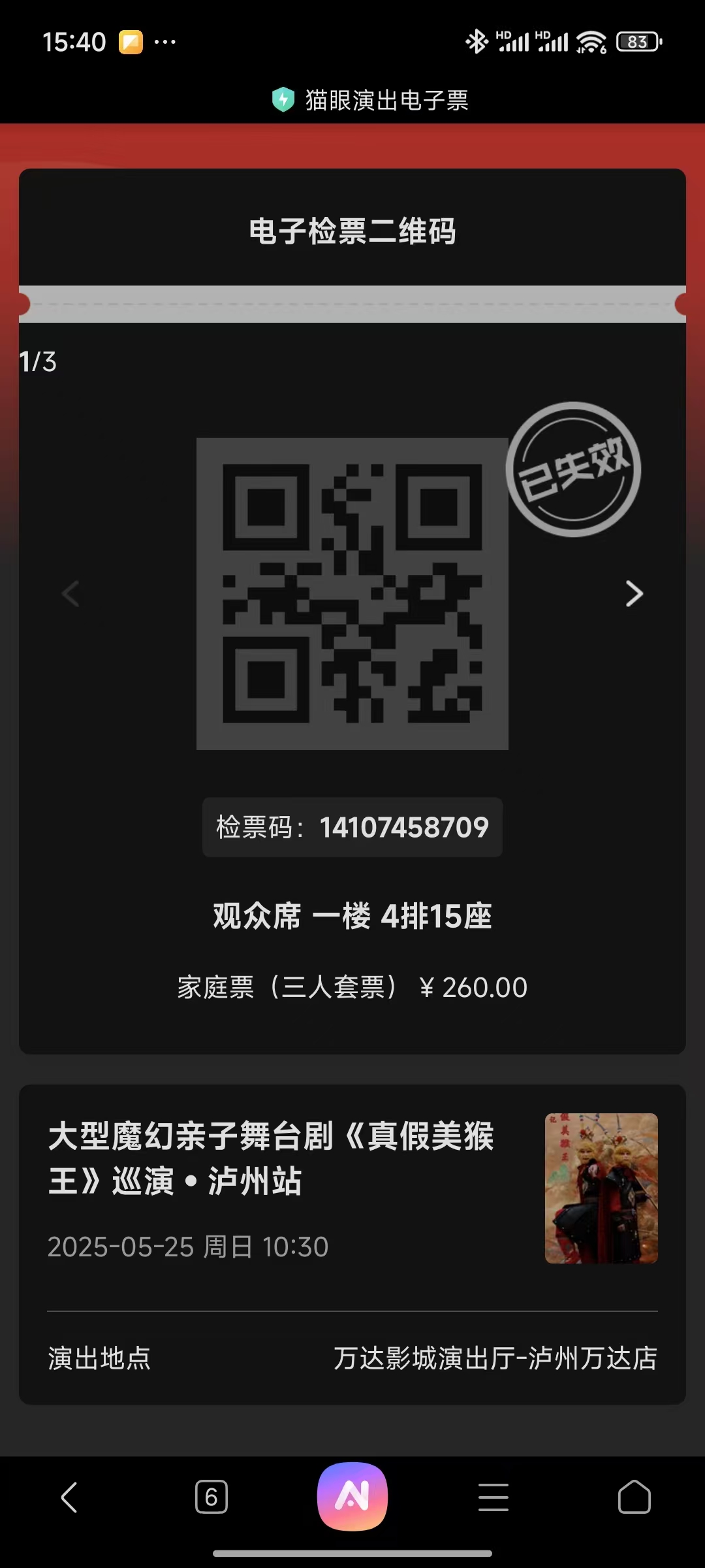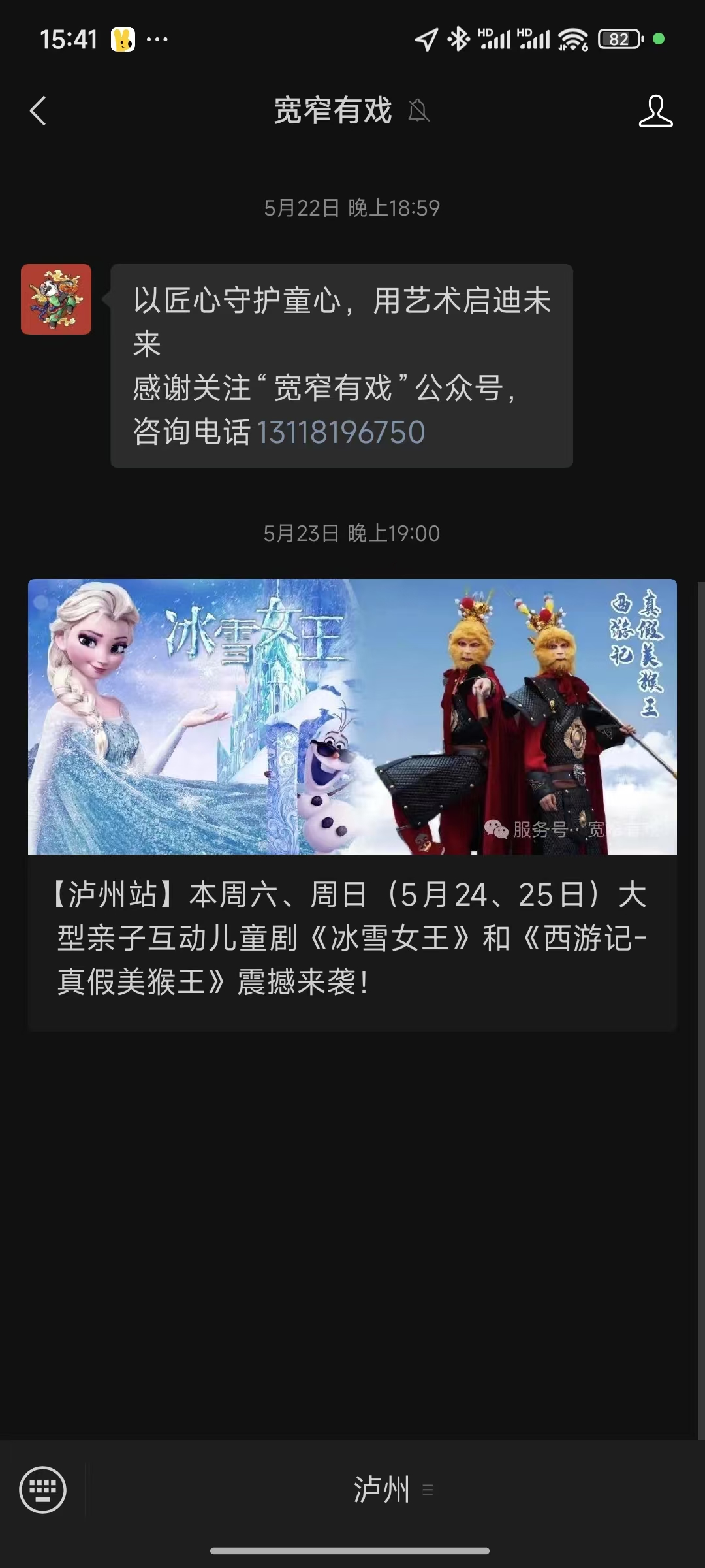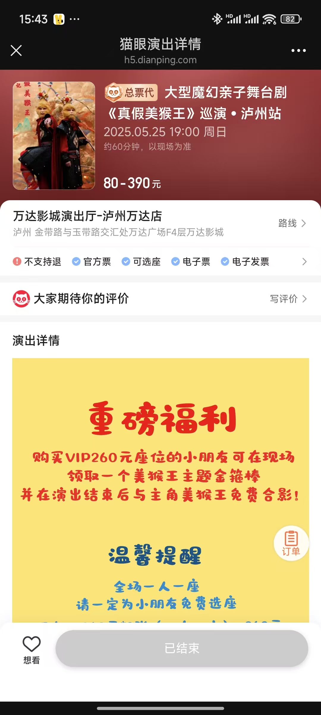 2025年5月25日泸州万达影城展演《真假美猴王》剧目,原定价三个档次260/180/80,优惠票价亲子票260一大一小,家庭票390两大一小。因孩子喜欢,考虑到泸州少有童话剧、音乐剧演出,就带着老人孩子一起去看,为了有更好的观影效果,买了最贵档次的家庭票,支付390,系统显示260。节目开始后,越看越不对劲。演员对口型演出,完全对不上,形体表演还不及幼儿园六一演出;多位演员表演过程中,服装饰品掉落;剧情节奏拖沓,改编混乱,没有尊重原著,虽然剧情中穿插有教育引导内容,但采用的现在网络元素并不有利于幼儿认知教育;剧目从舞美、妆效到对白、演艺质量粗糙,涉嫌虚假宣传,虚高票价。表演单位微信公众号“宽窄有戏”未四川童梦星河文化传媒有限公司,企业注册时间为2025年2月19日,公众号注册时间为2025年3月7日,但简介描述成立于2012年,且宣传词夸张。这种扰乱文化市场和破坏泸州文化商业生态的行为,请相关部门严查,并加大以儿童为受众的文化商业演出引入的审核和查处力度。