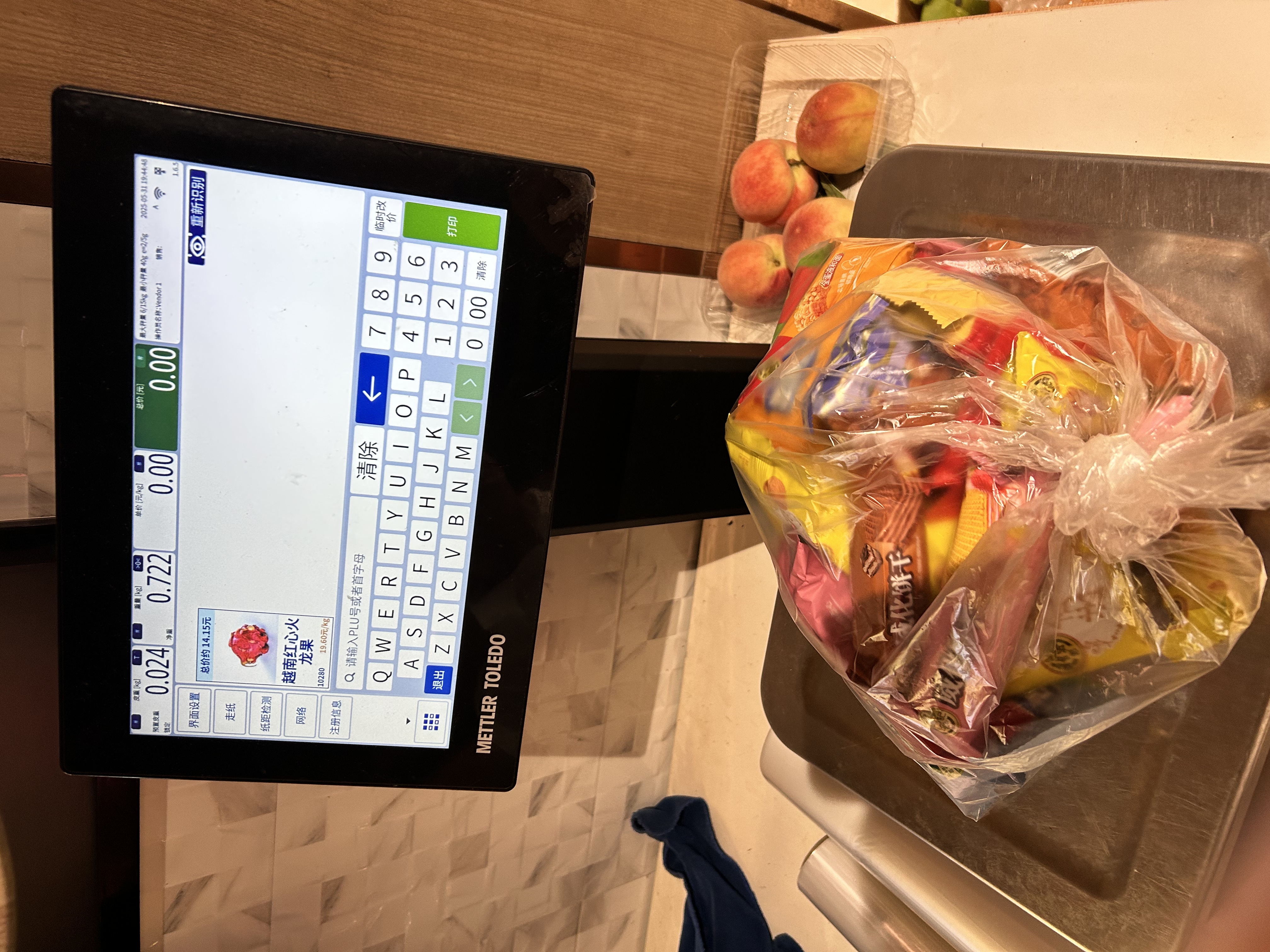 下图分别是:称重标签、自己找的咸菜区的秤、管理人员找的水果区的秤、带管理人员到散装区原本的秤