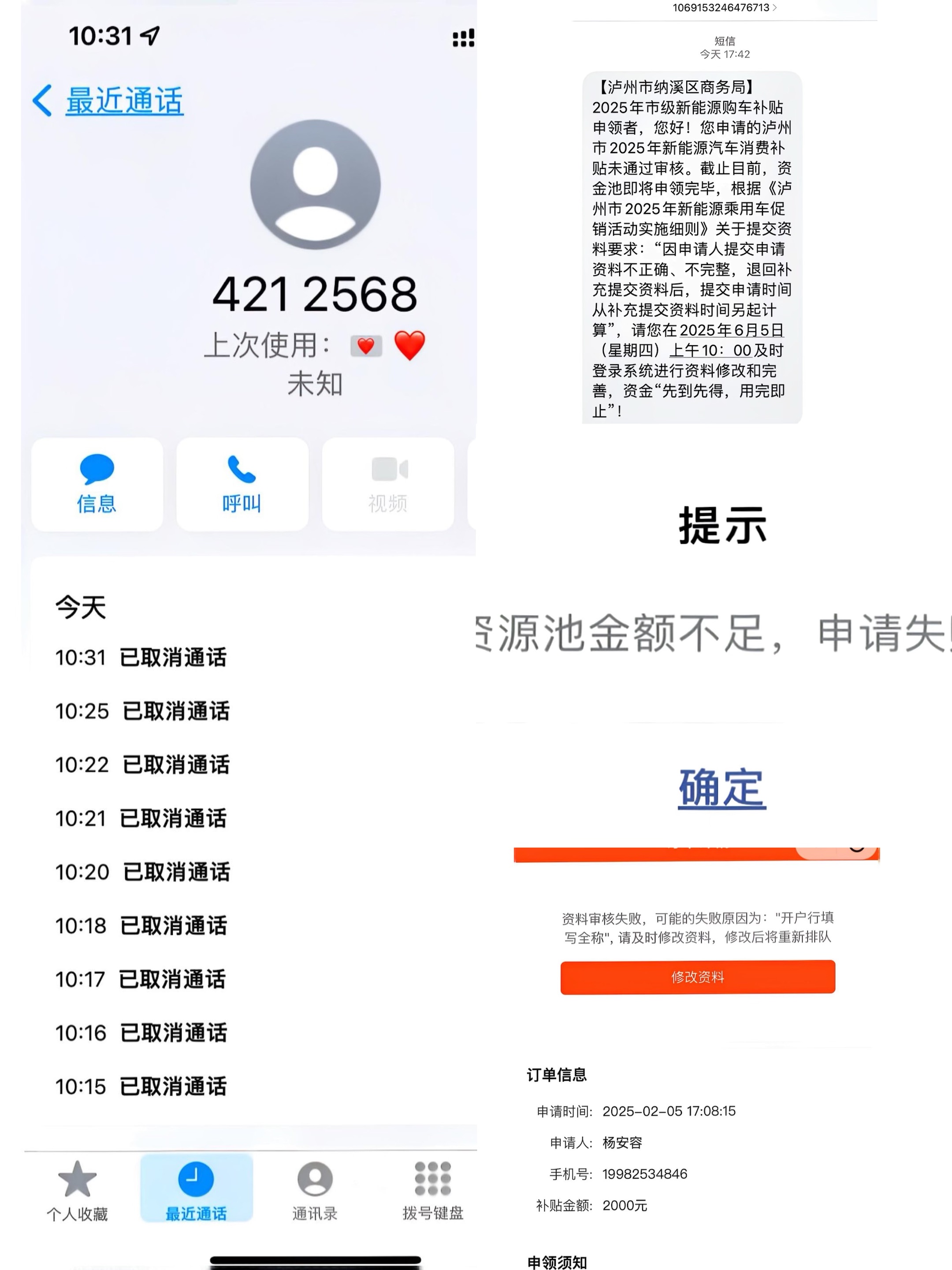本人于2025年2月3日购买比亚迪新能源汽车一辆,于2025年2月5日上牌成功。2025年2月5日17:08分上传“2025年泸州市新能源汽车购车补贴”资料。2025年6月4日下午17:42分收到泸州市纳溪区商务局短信通知:补贴申领资料不正确、不完整,退回补充,于2025年6月5日上午10点登录系统进行修改。本人于2025年6月5日上午10点登录系统修改资料提交,就显示资源池资金不足,申请失败。随后致电纳溪区商务局,从10:15-10:31分,打了9个电话,一直占线中。