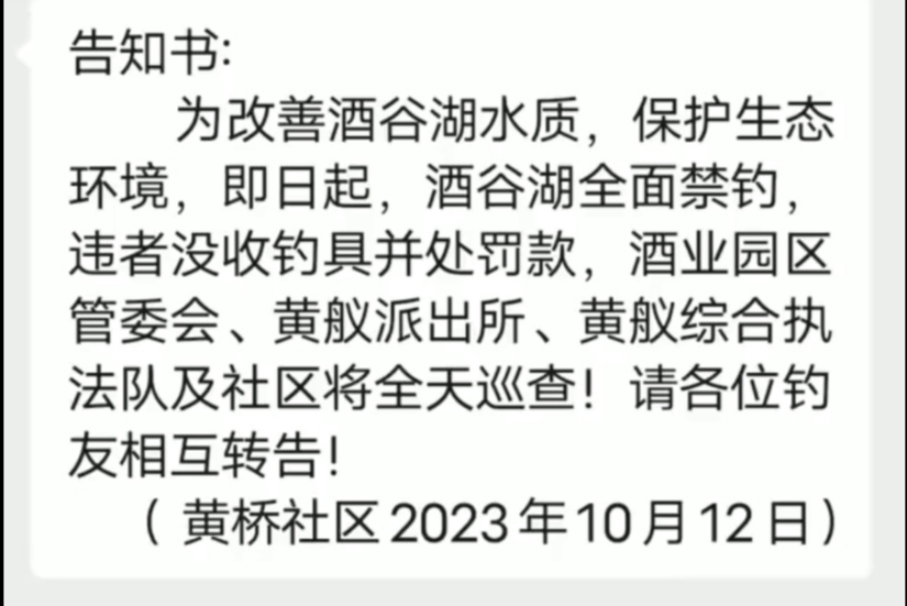 黄舣镇酒谷湖以前是个鱼塘,在征地后改造成为了酒谷湖,在酒谷湖前期是可以钓鱼的,也吸引了大量的钓鱼爱好者,但在23年10月份的发布了一折公告,说是为了改善水质,禁止钓鱼,还将没收钓具并处罚款的通知,但上面即没公章也没有农业农村局!我想了解下这个做法是否合理合法。