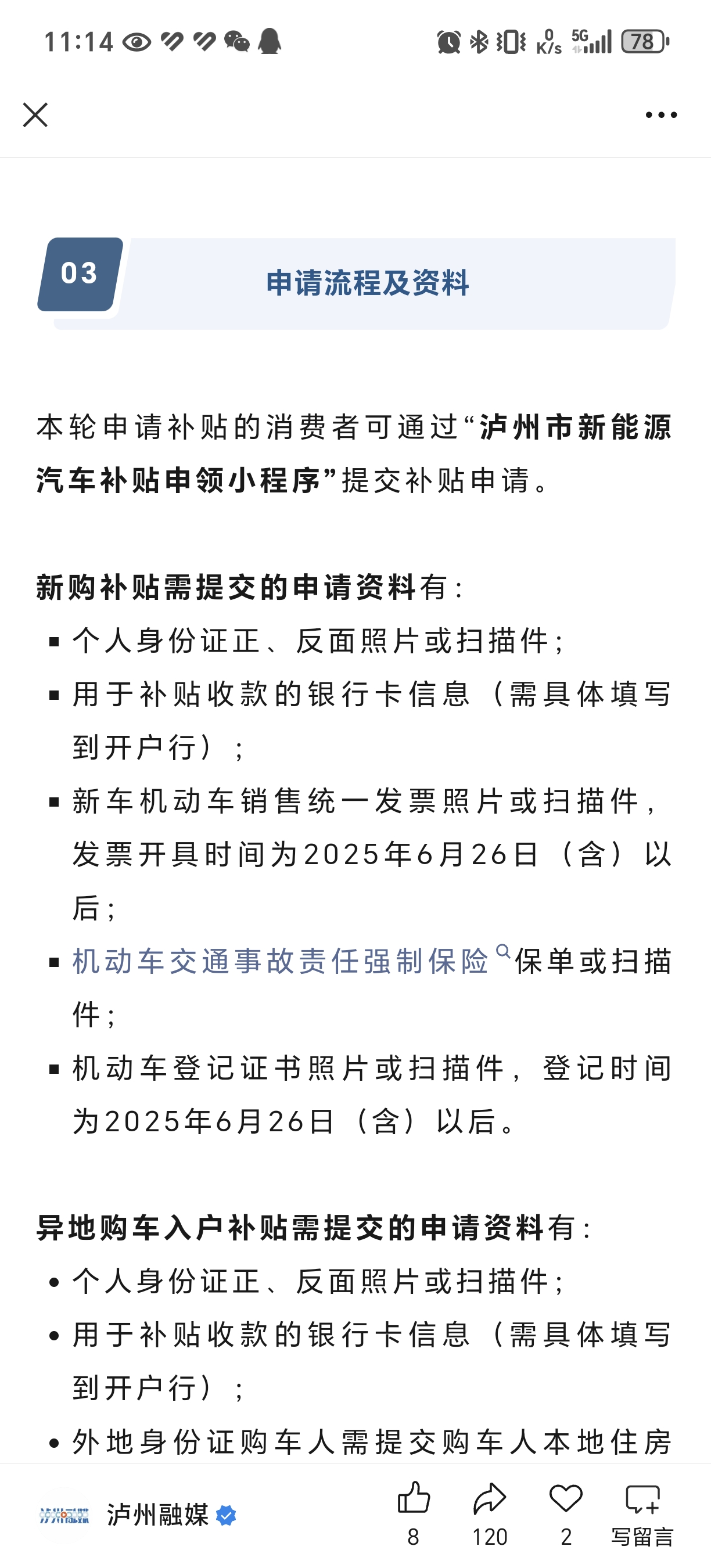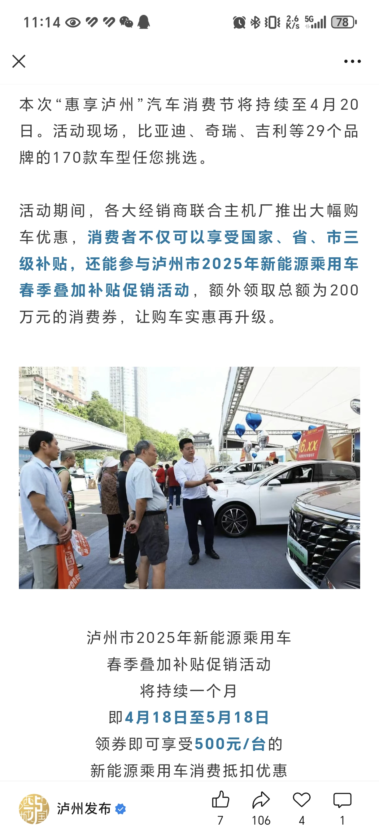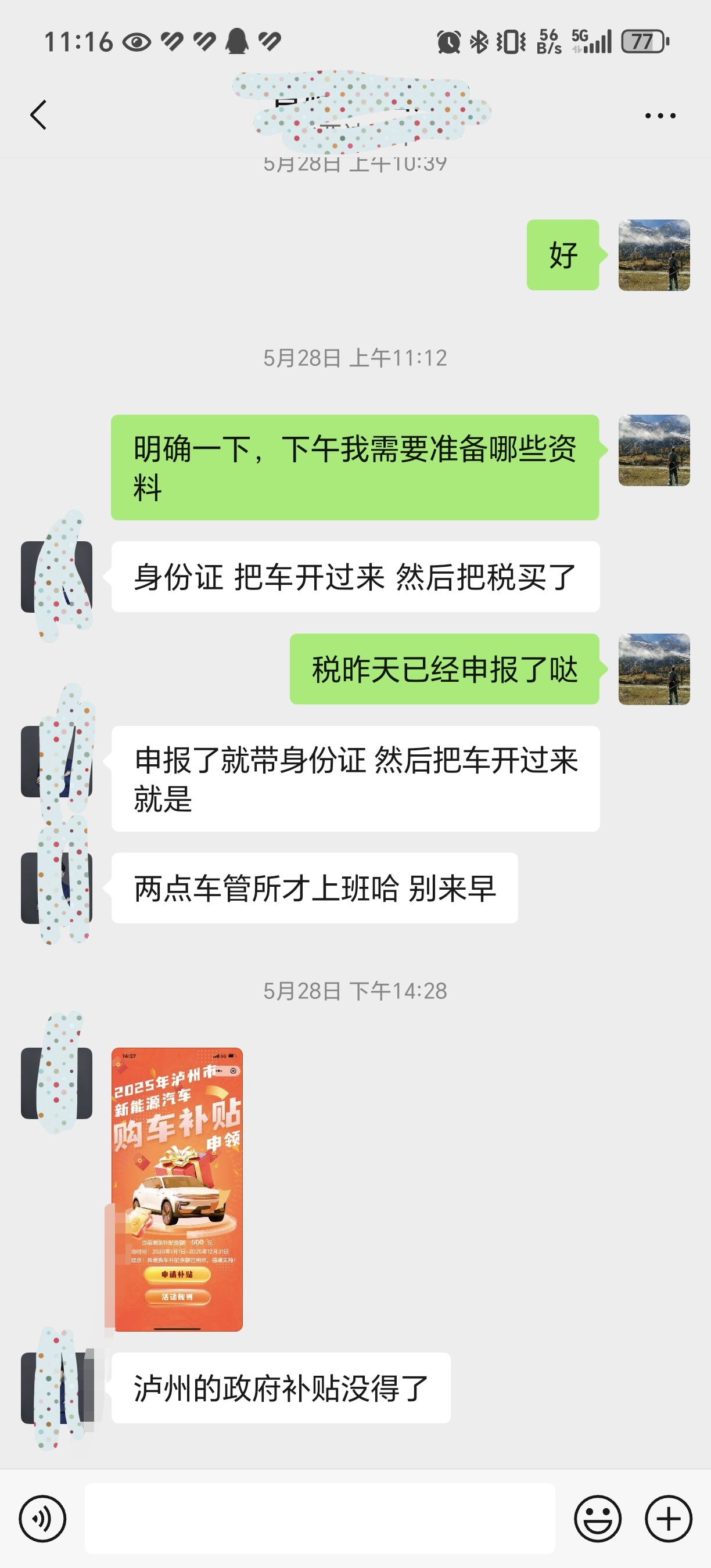 2025年4月18-20日,在江阳区滨江路“飞机坝”举办了2025“惠享泸州”汽车消费节,并且补贴促销活动持续一个月,即4.18-5.18。本人积极响应消费活动,在活动期间定车,5月25号(星期天)才提车,但5月28号泸州新能源汽车补贴(700万元)就没有了。一直到6月25日,看到新一轮新能源汽车购置补贴(2600万元)的政策,但是发现补贴资料要求发票开票日期为6月26日以后。