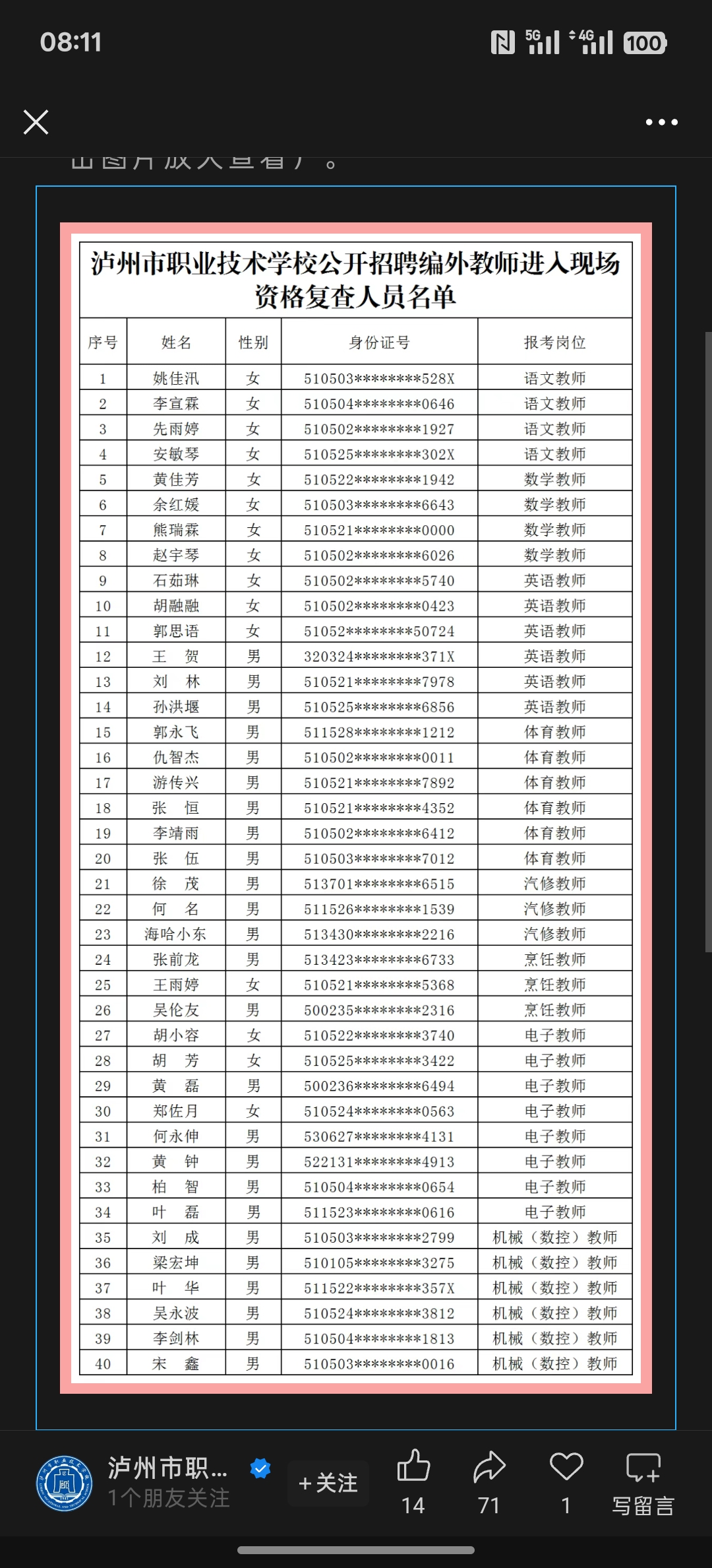 上述流程已通过《泸州市职业技术学校公开招聘编外教师面试考核及后续工作的公告》在学校微信公众号上公开发布,并通过报名邮箱逐一告知所有考生,确保信息透明。