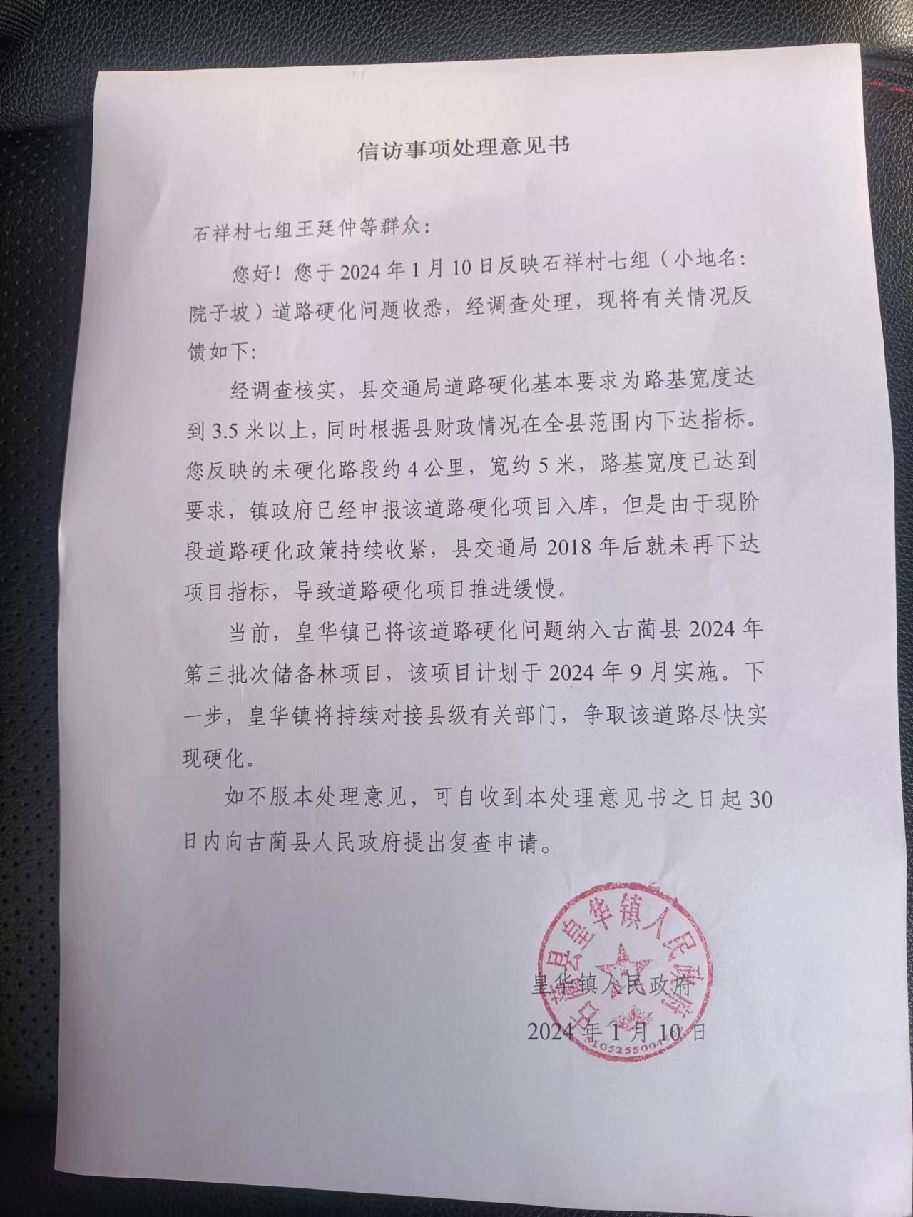 您好!您反映的古蔺县皇华镇石祥村7组道路硬化问题的留言收悉,现将有关情况反馈如下。