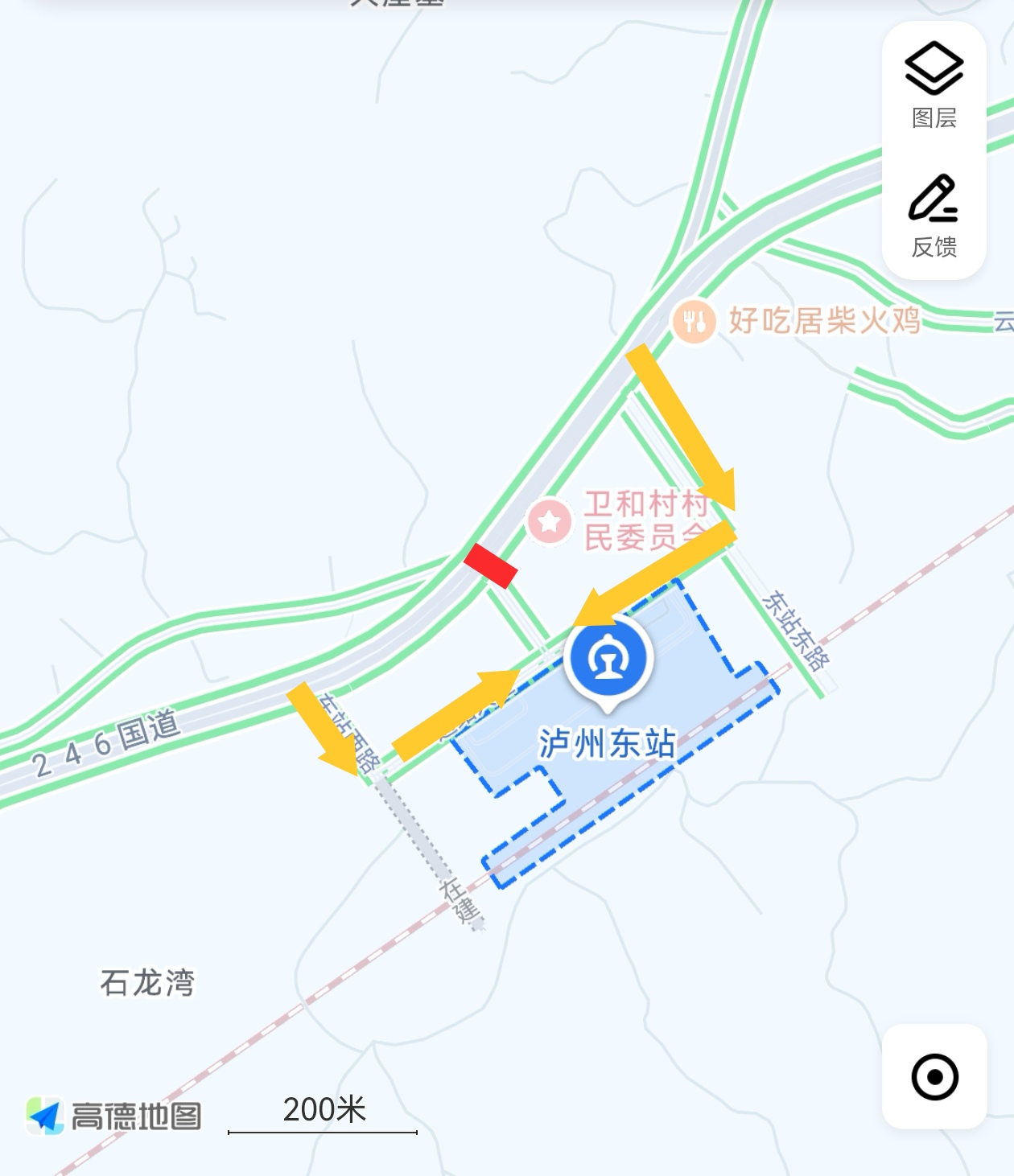 关于泸州东站(泸县云锦镇)站前广场正对面的道路与246国道交界处,建议设置过街人行道。当前车行已有东站东路与东站西路与246进行连接。我们要考虑其余(无车/使用公共交通工具)群众坐车的需求,建议增设人行通道,方便人员在246国道下车后直接跨路走向高铁站。当前路径为黄色➡,增设后可从红色线跨越道路直达高铁站。